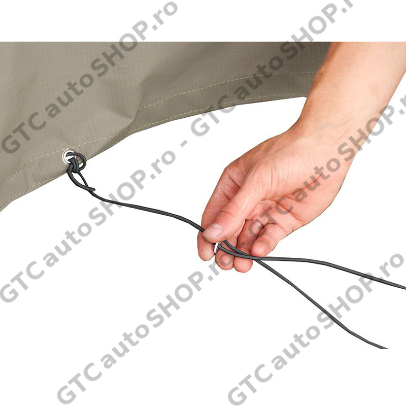 Cadrul din otel inoxidabil al cabinei se fixeaza in cele doua suporturi de prindere. Glisati cu usurinta peste cadrul tubulaturii, perdeaua de dus ce are grosime de 240 g/m² si protectie UV, astfel incat puteti crea o incinta privata. Se folosesc franghii pentru a fixa colturile perdelei iar aceasta se poate depozita ordonat in geanta de transport furnizata.
