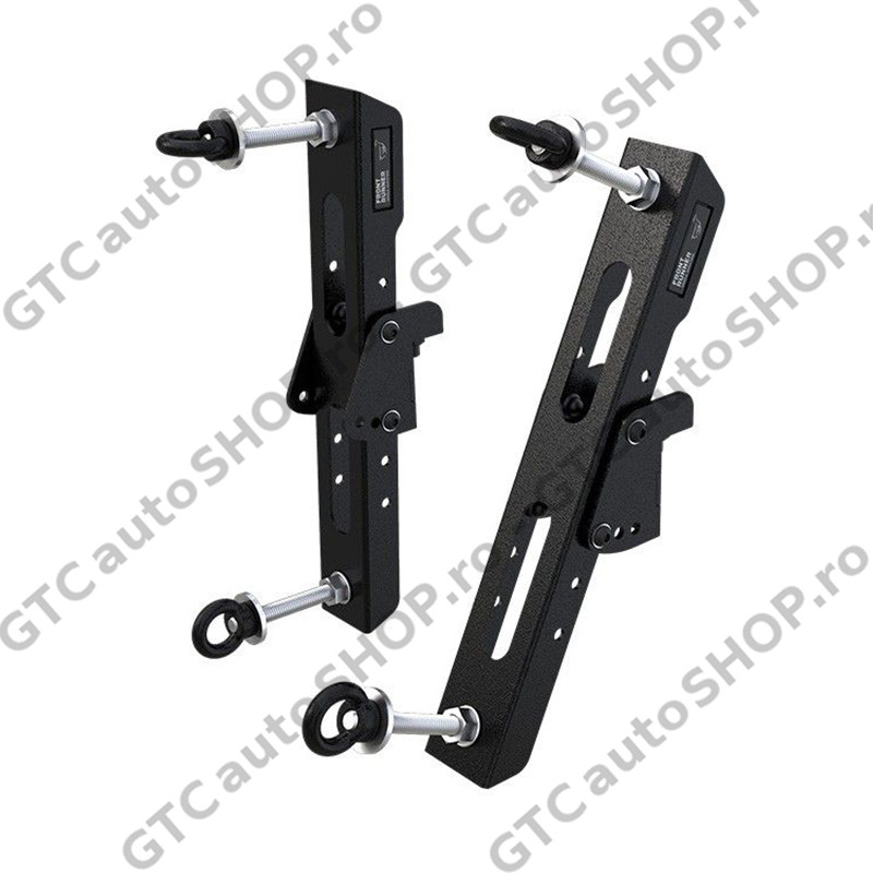 Cu aceste suporturi laterale si articulate se pot monta pe laterala portbagajului Front Runner echipamente de recovery precum traverse Maxtrax, TRED Pro sau alte marci similare, cu o distanta asemanatoare intre gaurile de prindere. Se monteaza pe profilul lateral al portbagajului Front Runner Slimline II pentru a salva spatiul de stocare de deasupra.