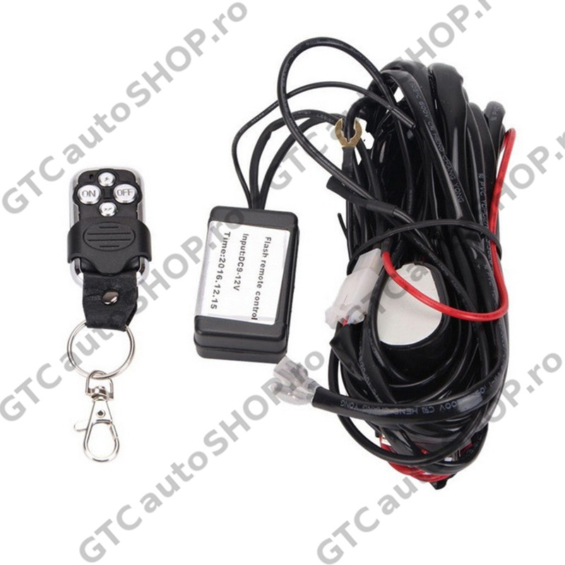 Cablaj wireless cu telecomanda, buton ON/OFF, releu si siguranta pentru pornirea/oprirea a unuia sau a mai multor proiectoare/led bar cu puterea totala insumata de maxim 288W.