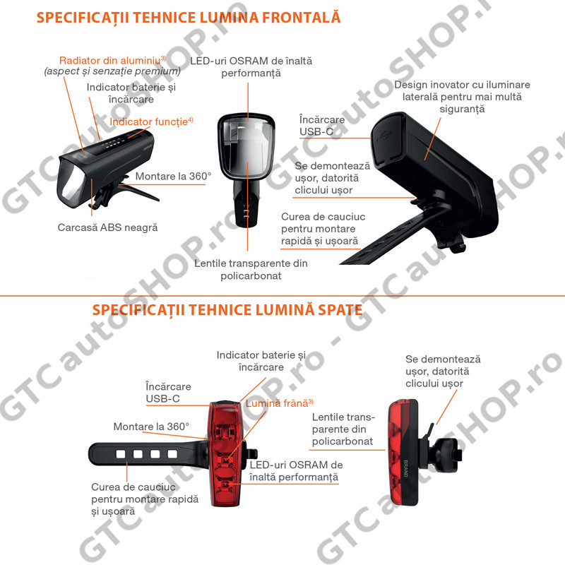Cablul USB-C inclus asigura incarcarea convenabila a bateriei litiu-ion, in timp ce indicatorul de baterie si incarcare va informeaza cu privire la starea curenta. Nu numai ca lumina frontala impresioneaza prin performanta ei deosebitam dar are si un design elegant si inovator. Iluminatul lateral modern iese in evidenta, adaugand atat stil, cat si vizibilitate imbunatatita. Constructia de inalta calitate, care include o carcasa din ABS negru si lentile transparente din policarbonat, promite durabilitate si fiabilitate. Cu certificarea IP44, prezinta protectie la apa, astfel incat sa fiti in siguranta pe sosea chiar si pe vreme rea. Osram ofera garantie de 2 ani pentru toate luminile de bicicleta LEDsBIKE RACE.