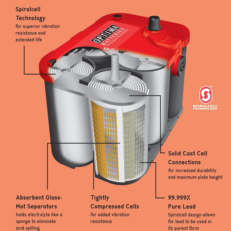 Bateria Optima Red Top este cunoscuta ca si bateria cu gel; este vorba de tehnologia Optima Spiralcell; este proiectata sa asigure curent foarte mare la pornire, dar nu este destinata utilizarii tip deep cycling / descarcari adanci ( pentru aceasta exista Optima Yellow Top sau Blue top). Este practic cea mai puternica baterie la pornire pentru 5 secunde.