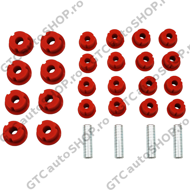 Kitul contine bucsi si antretoze pentru toate cele 4 arcuri cu foi. Calitatea buna a poliuretanului si pelucrarea acestora fac ca bucsile sa fie foarte rezistente, inclusiv la torsionari mai mari.