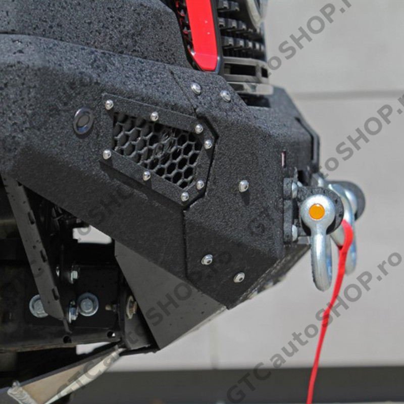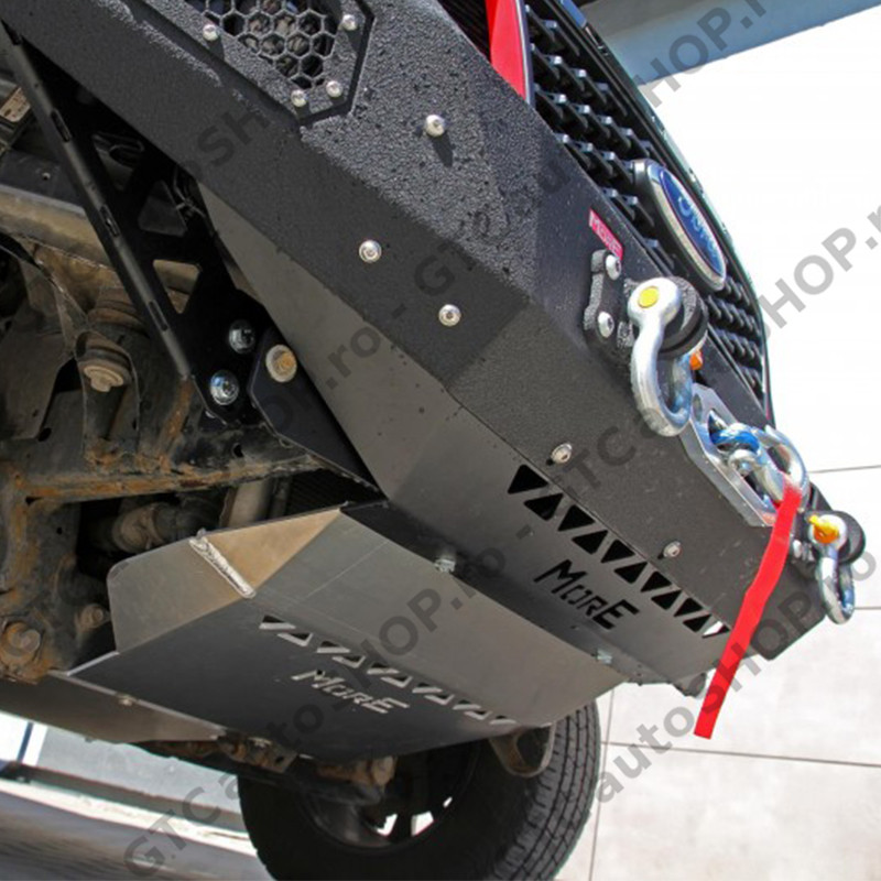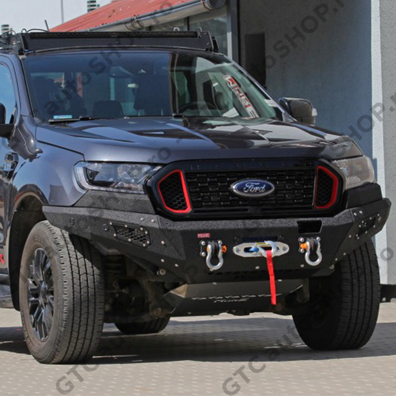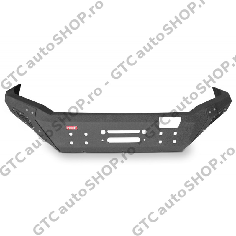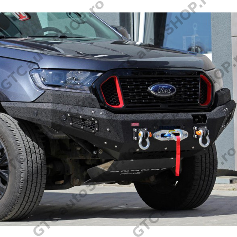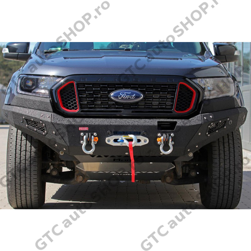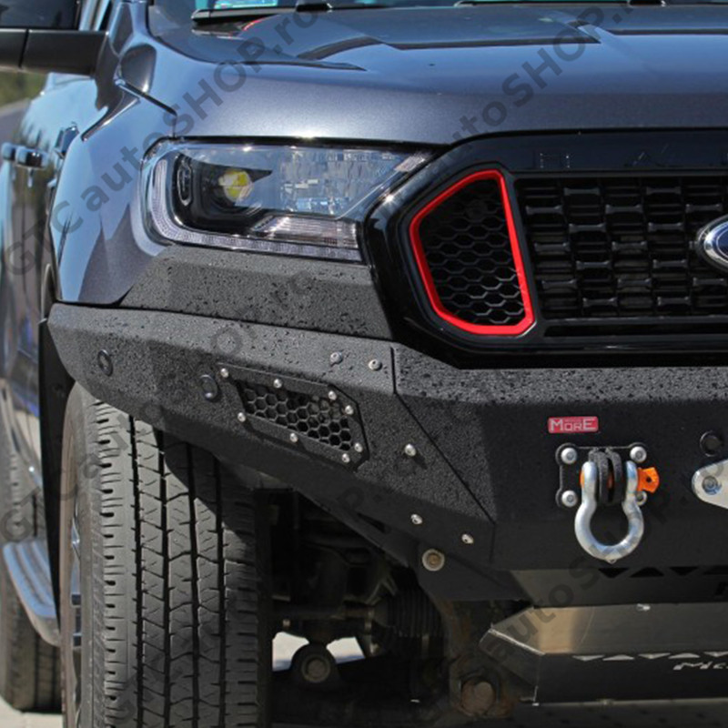 Bara protecte fata pentru Ford Ranger productie 2016-2022, cu suport de troliu incorporat. Bara de la MORE 4x4 este din otel si este vopsita cu vopsea structurala de culoare neagra, similara Raptor Coating. Este o bara solida cu o forma apropiata de cea originala, dar care are unghi de atac imbunatatit si permite montarea unor roti mai mari.