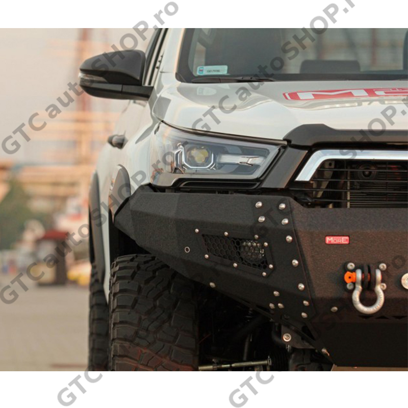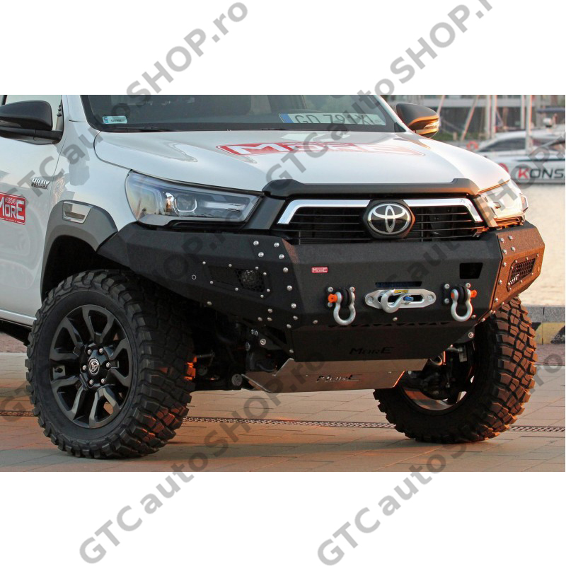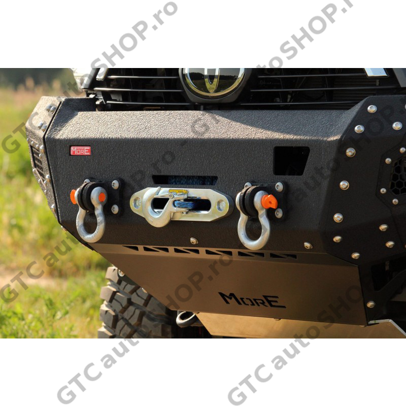 Bara de la MORE 4x4 este din otel si este vopsita cu vopsea structurala de culoare neagra, similara Raptor Coating. Este o bara solida cu o forma apropiata de cea originala, dar care are unghi de atac imbunatatit si permite montarea unor roti mai mari.