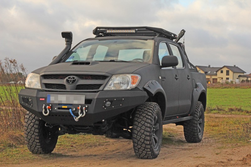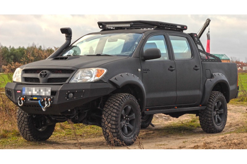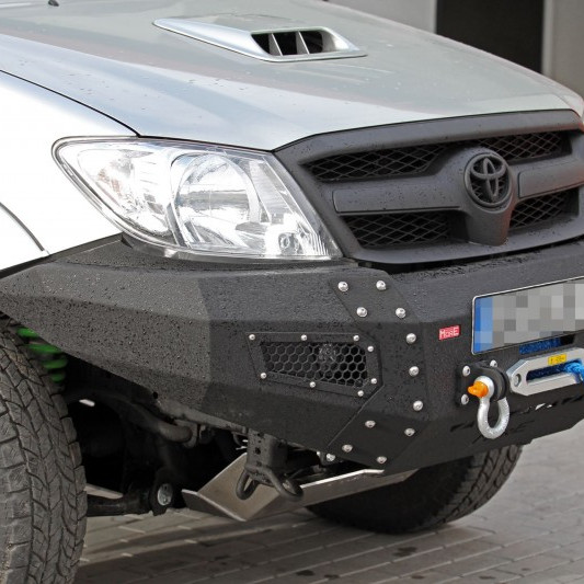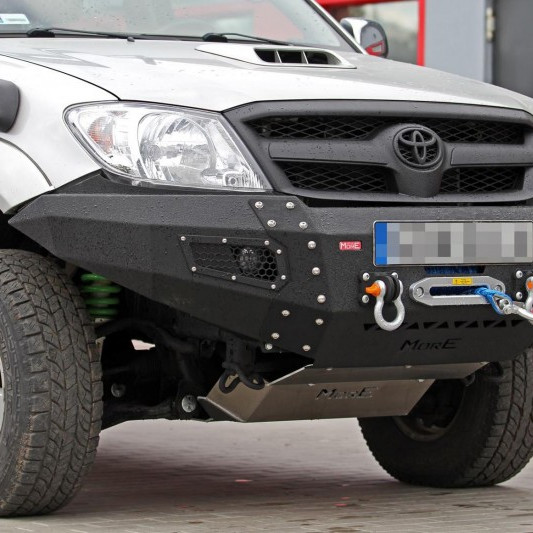 Bara protecte fata pentru Toyota Hilux Vigo 2005-2011, cu suport de troliu incorporat. Bara de la MORE 4x4 este din otel si este vopsita cu vopsea structurata de culoare neagra, similara Raptor Coating. Este o bara solida cu o forma apropiata de cea originala, dar care are unghi de atac imbunatatit si permite montarea unor roti mai mari.