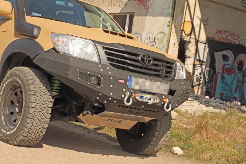 Bara protecte fata pentru Toyota Hilux Vigo 2011-2015 (facelift), cu suport de troliu incorporat. Bara de la MORE 4x4 este din otel si este vopsita cu vopsea structurata de culoare neagra, similara Raptor Coating. Este o bara solida cu o forma apropiata de cea originala, dar care are unghi de atac imbunatatit si permite montarea unor roti mai mari.