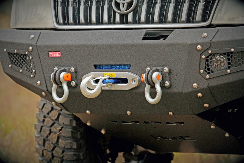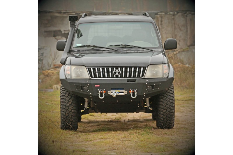 Bara protecte fata pentru Toyota Land Cruiser 90/95, productie 1995-2002, cu suport de troliu incorporat. Bara de la MORE 4x4 este din otel si este vopsita cu vopsea structurala de culoare neagra, similara Raptor Coating. Este o bara solida cu o forma apropiata de cea originala, dar care are unghi de atac imbunatatit si permite montarea unor roti mai mari.