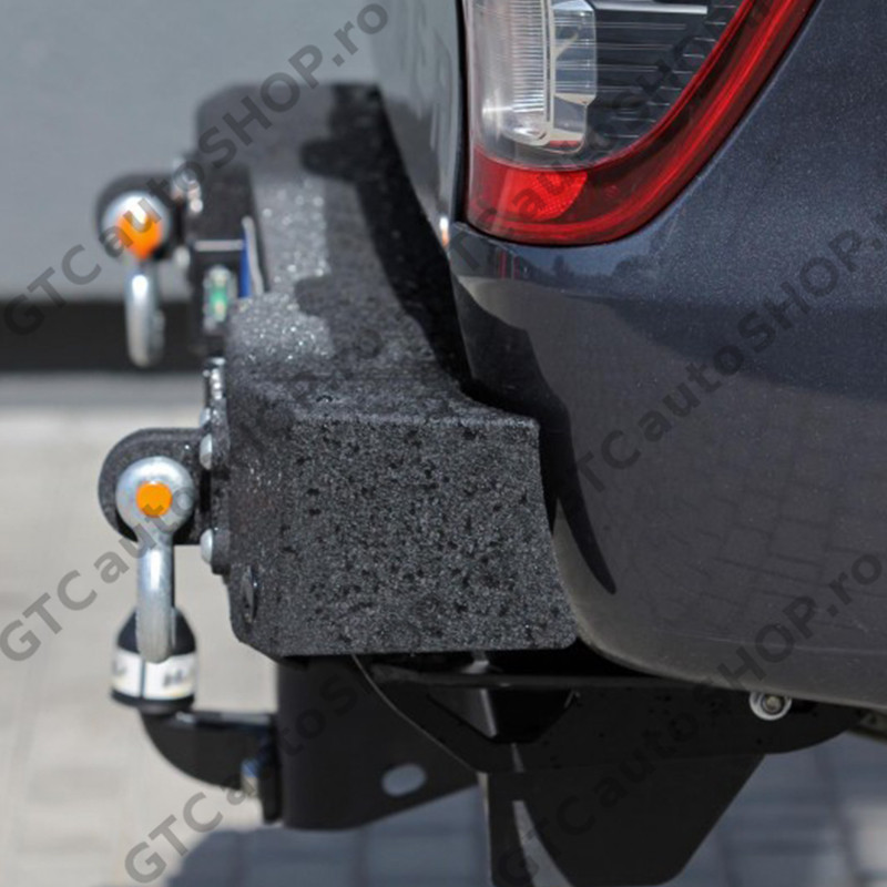 Bara de la MORE 4x4 este din otel si este vopsita cu vopsea structurala de culoare neagra, similara Raptor Coating. Este o bara solida dar care are forma cat mai apropiata de cea originala, permitand montarea unui carlig de remorcare OE sau echivalent.