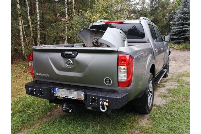 Bara protectie spate pentru Nissan Navara NP300 (D23) productie 2014-prezent, care este prevazuta si cu posibilitatea montarii unui suport rabatabil de roata rezerva, Hi-Lift si canistra/canistre.