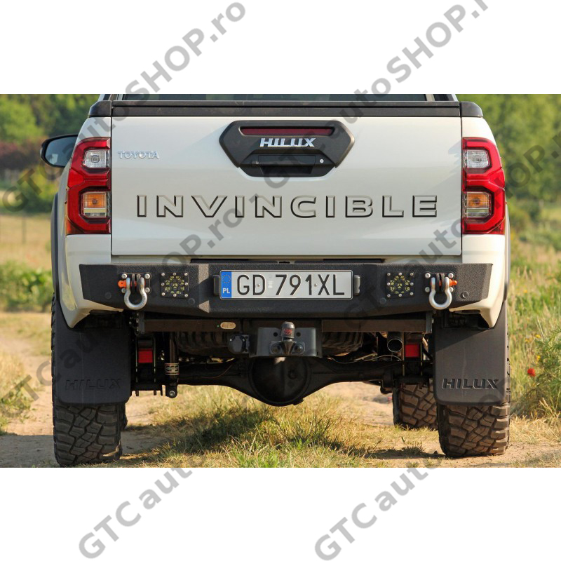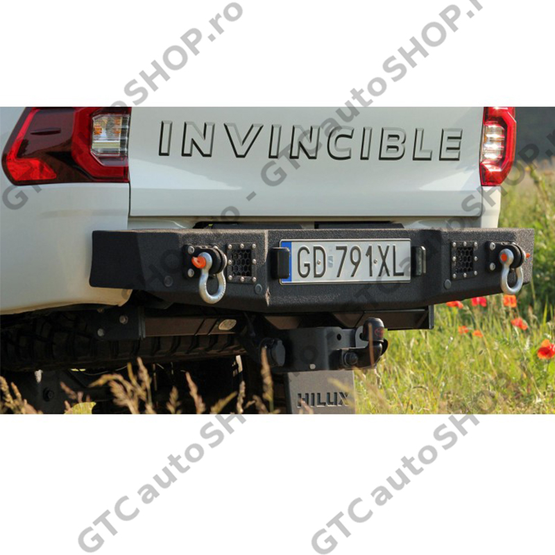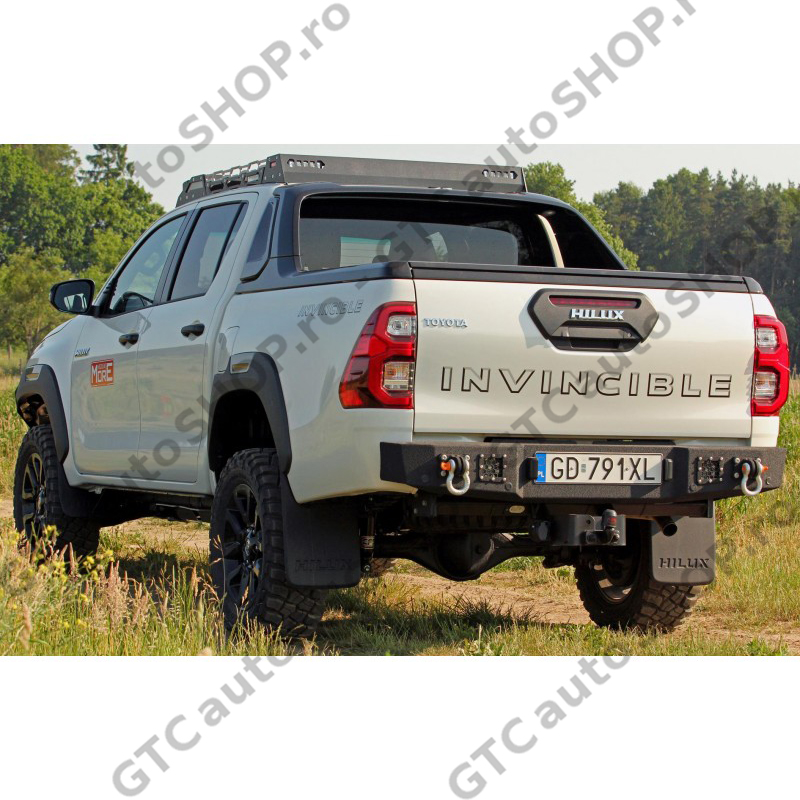 Bara protectie spate pentru Toyota Hilux Revo productie dupa 2015, care este prevazuta si cu posibilitatea montarii unui suport rabatabil de roata rezerva, Hi-Lift si canistra/canistre.