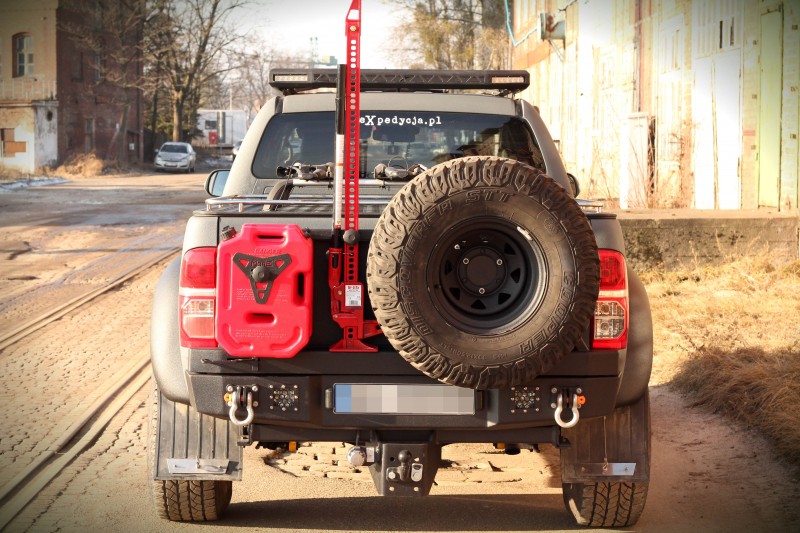 Bara protectie spate pentru Toyota Hilux Vigo productie 2005-2015, care este prevazuta si cu posibilitatea montarii unui suport rabatabil de roata rezerva, Hi-Lift si canistra/canistre.