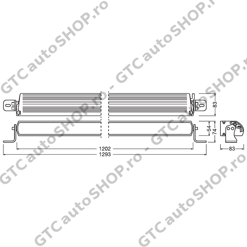-Dimensiuni bara LED cu suporti: 1293mm lungime x 83mm latime x 74mm inaltime