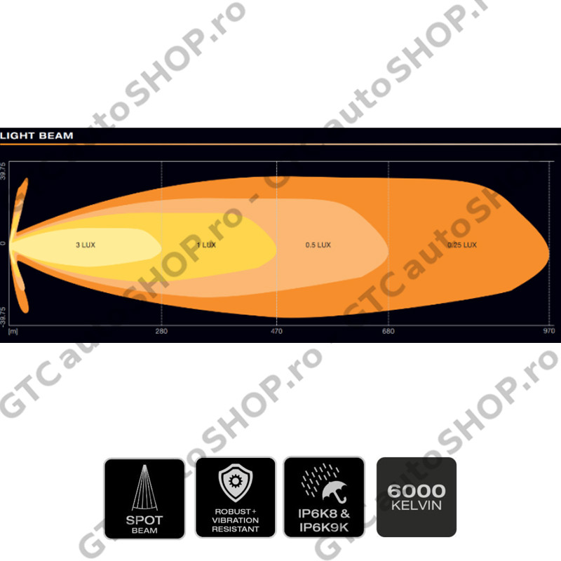 Explorati cele mai intunecate colturi ale lumii. Bara LED generatie noua (Gen2) de la OSRAM FX500-SP SM ofera o lumina impresionanta si o performanta ridicata. Fiind varianta Spot, cu unghiul fascicului luminii de 5 grade pe orizontala , aceasta este instrumentul potrivit pentru a ilumina orice aventura de off-road.