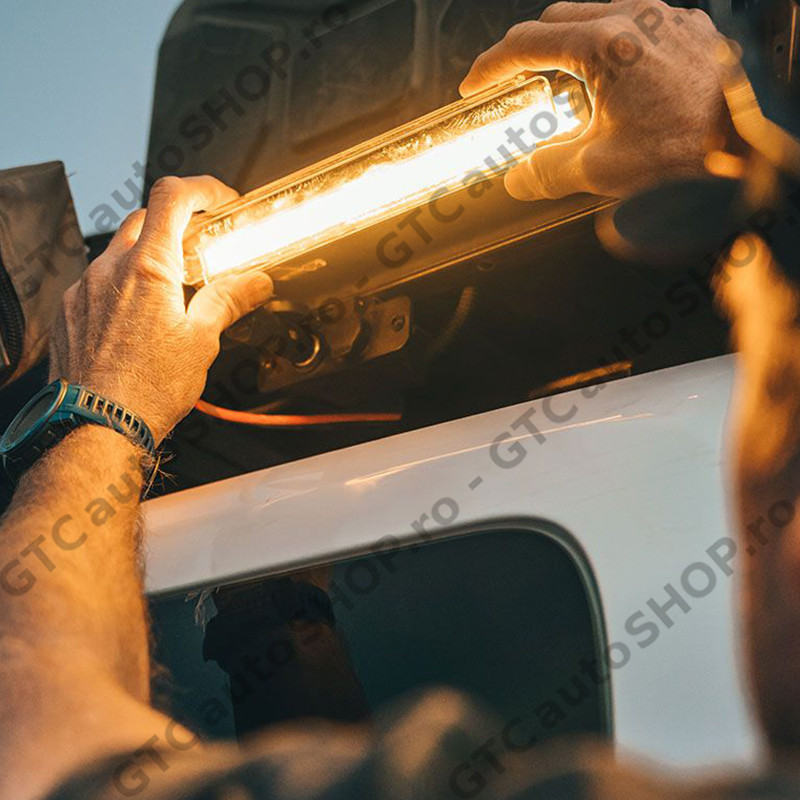 Este ideala pentru a fi utilizata in orice excursie, sesiune de overlanding, off-road, pescuit, vanatoare etc. Se poate folosi si ca lumina de lucru pentru tabara de camping. Este prevazuta cu driver integrat si sistem de management termic ce masoara si regleaza temperatura LED-urilor, eliminand riscul de supraincalzire. De asemenea, are protectie completa a polaritatii, intrerupe automat circuitul in cazul unei tensiuni excesive si ofera protectie la supratensiune.