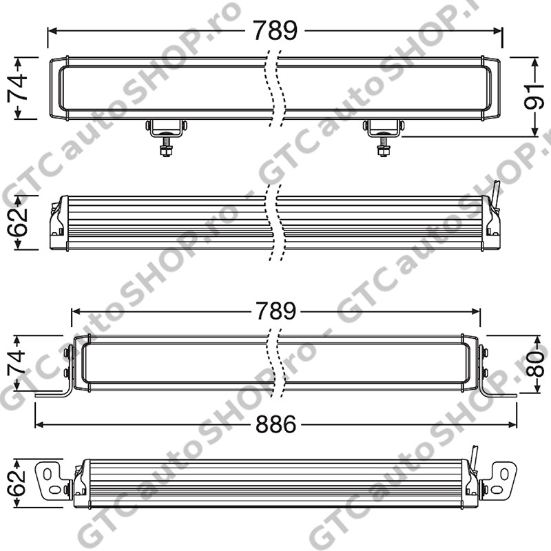 -Dimensiuni doar bara LED: 789mm lungime x 62mm latime x 74mm inaltime