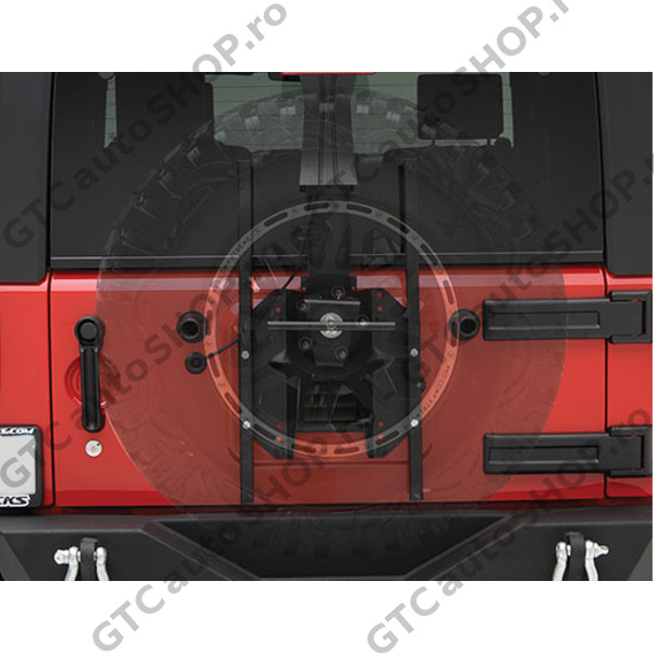 Suport roata rezerva de la Smittybilt care permite montarea unei roti mai mari, de pana la 37 inch, atat cu bara de origine cat si cu bare aftermarket.