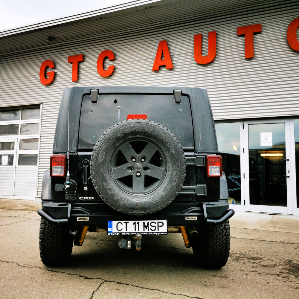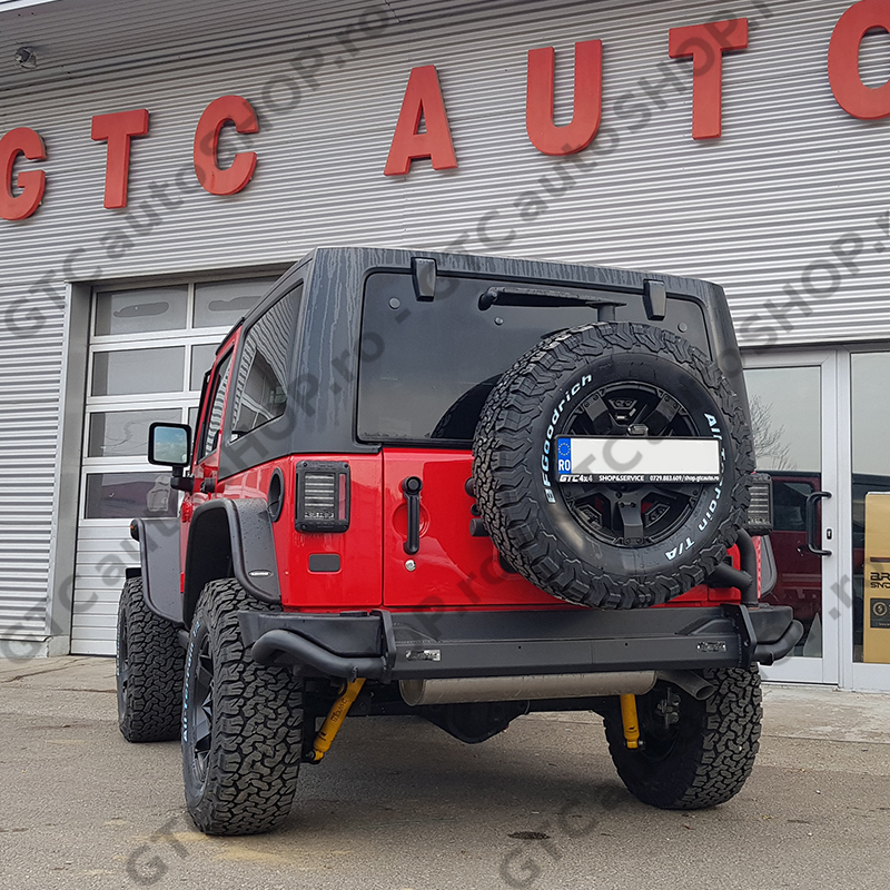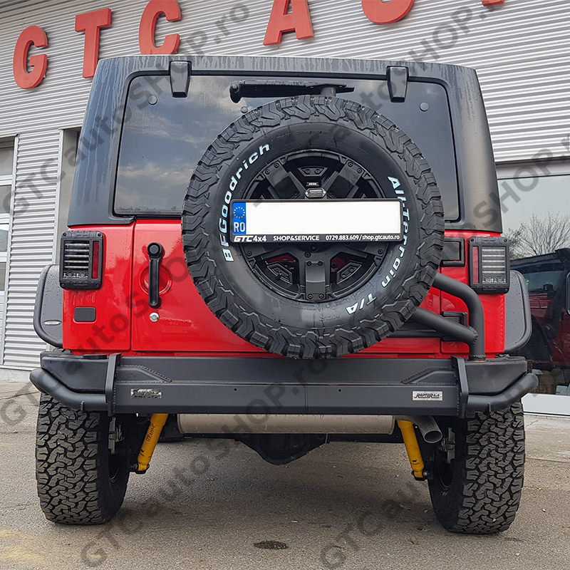 Permite montarea pe bara a unui suport dedicat pentru roata de rezerva (nu este inclus), care costa 500 euro; vezi https://shop.gtcauto.ro/produse//suport-roata-rezerva-bara-spate-raptor-4x4-jeep-jk