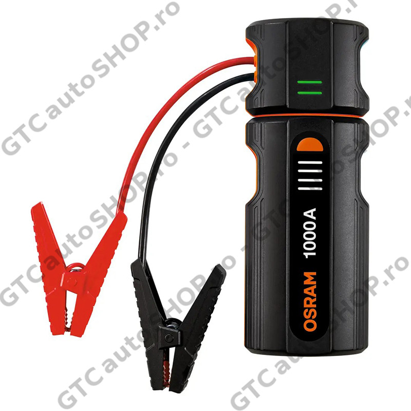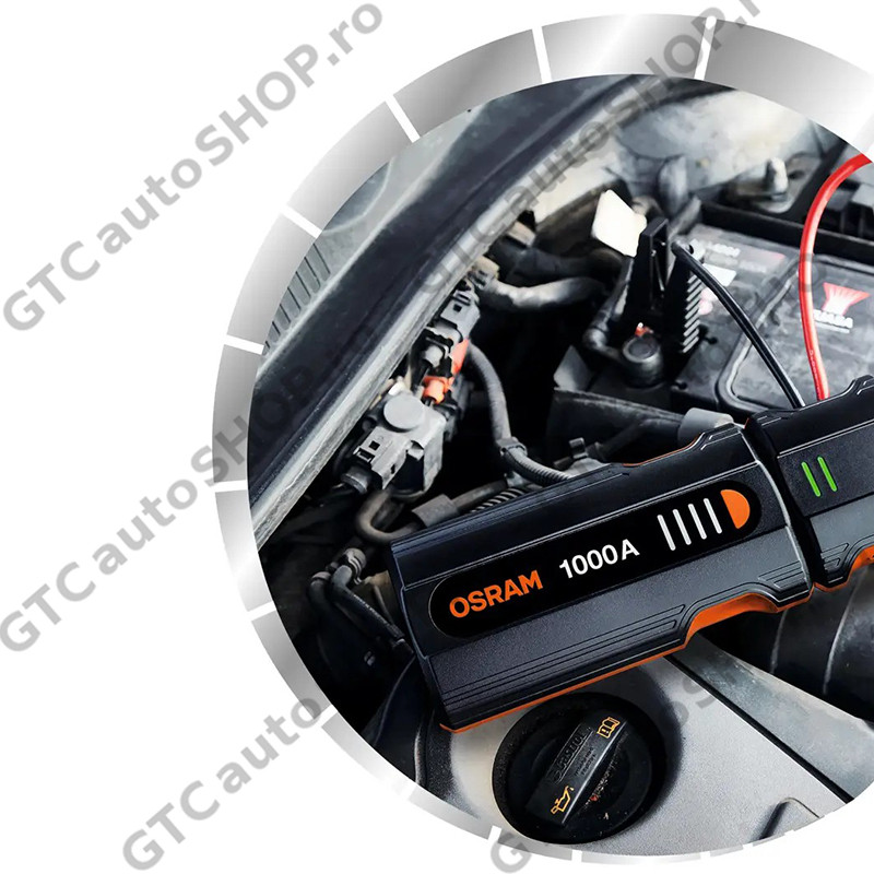 OSRAM BATTERYjumpstart 1000 poate porni vehicule cu motoare de pana la 5L benzina sau 2L diesel. Este potrivit pentru majoritatea masinilor, furgonetelor, SUV-urilor si vehiculelor comerciale usoare de 12V. Functia de boost permite pornirea bateriilor complet descarcate. Conexiunea ergonomica unica cu clesti smart are cabluri mai lungi pentru o mai buna accesibilitate in zonele greu accesibile. Caracteristicile de siguranta includ protectie la polaritate inversa, protectie la supratensiune si protectie la scurtcircuit, cu indicatoare acustice si LED. O lanterna integrata lumineaza zona de lucru, iar indicatorii LED afiseaza nivelul curent al bateriei. Unitatea include un port USB-C cu incarcare rapida 30W si un port USB-A pentru incarcarea dispozitivelor precum tablete si telefoane.