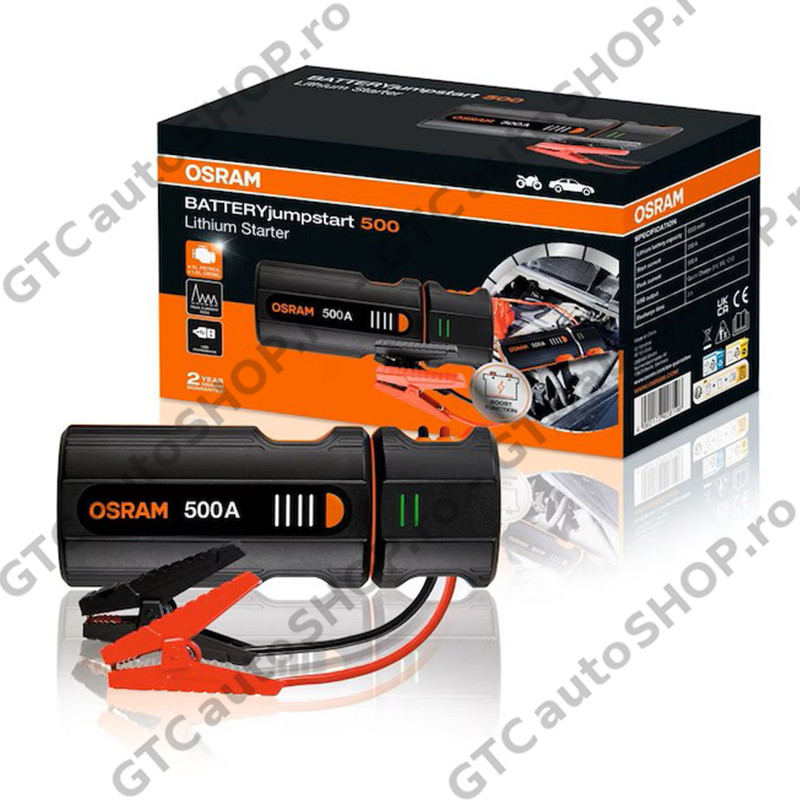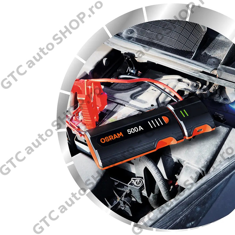 OSRAM BATTERYjumpstart 500 poate porni vehicule cu motoare de pana la 3L benzina sau 1.5L diesel. Este potrivit pentru majoritatea masinilor, furgonetelor, SUV-urilor si vehiculelor comerciale usoare de 12V. Functia de boost permite pornirea bateriilor complet descarcate. Conexiunea ergonomica unica cu clesti smart are cabluri mai lungi pentru o mai buna accesibilitate in zonele greu accesibile. Caracteristicile de siguranta includ protectie la polaritate inversa, protectie la supratensiune si protectie la scurtcircuit, cu indicatoare acustice si LED. O lanterna integrata lumineaza zona de lucru, iar indicatorii LED afiseaza nivelul curent al bateriei. Unitatea include un port USB-C pentru reincarcare si un port USB-A pentru incarcarea dispozitivelor precum tablete si telefoane.