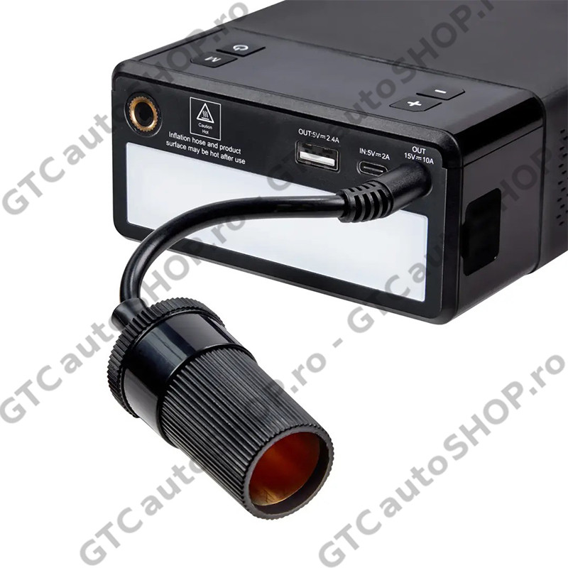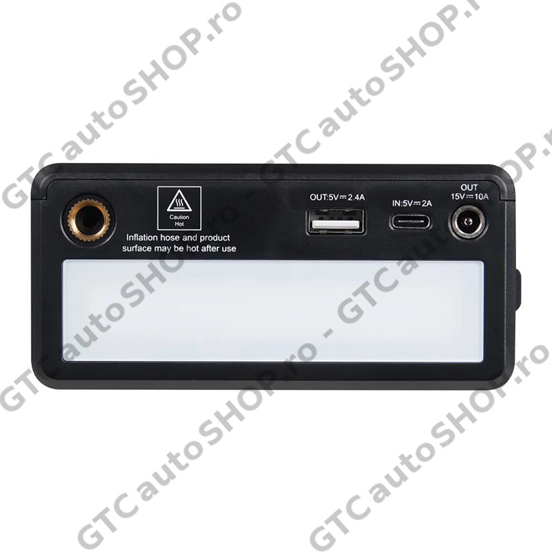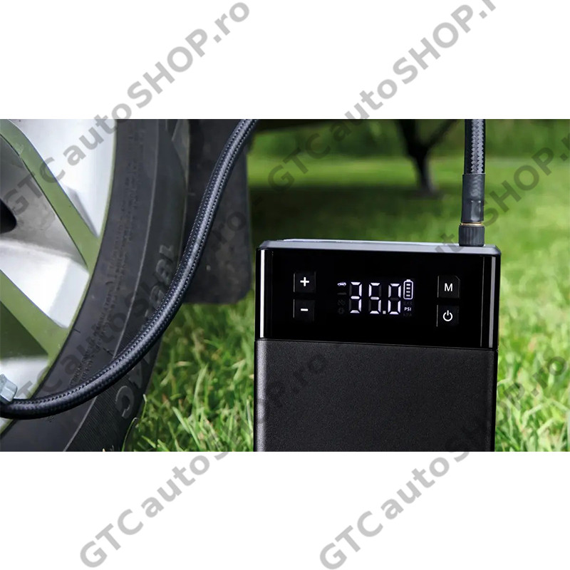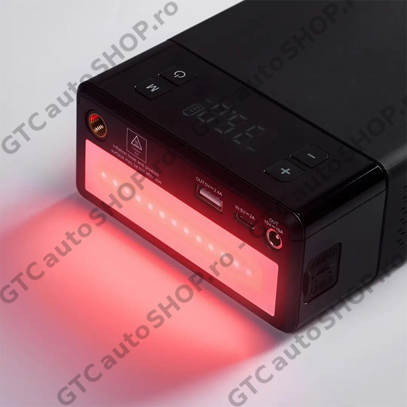 Trebuie sa iti mentii anvelopele in parametri? Compresorul de aer incorporat are un manometru digital si functie de oprire automata pentru o umflare usoara si precisa. Priza de 12V iti permite sa alimentezi o gama de dispozitive prin bricheta masinii, iar bateria externa cu port USB asigura ca iti poti incarca telefonul sau alte gadgeturi oriunde te-ai afla.