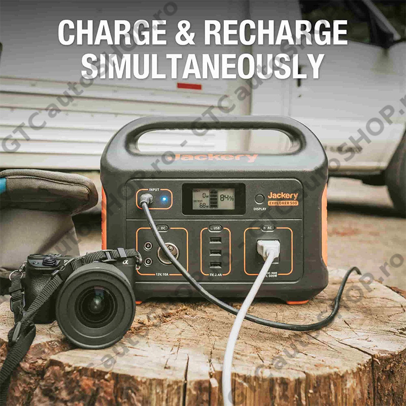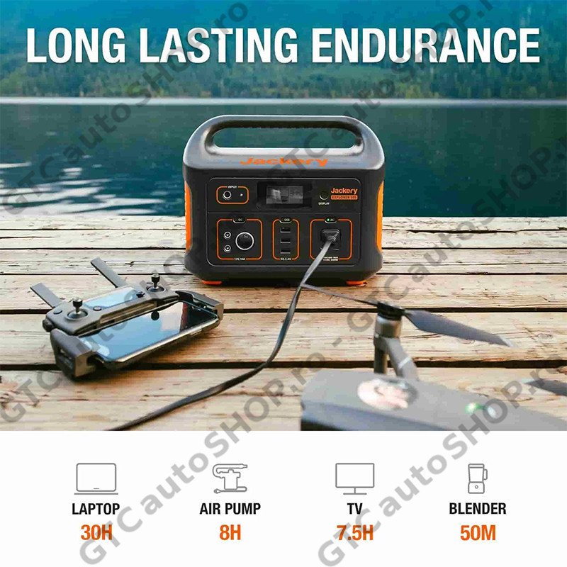 Capacitate mare: Jackery Explorer 500 are o putere de 518 Wh (24Ah. 21.6V) cu o baterie lithium-ion si un invertor cu unda pura sinusoidala. Generatorul are 1 priza AC (220V 500W 1000W varf), 4 porturi USB, 2 prize DC EU si 1 port auto pentru alimentarea lenta a echipamentelor precum frigidere auto mini, pompe de aer, TV etc.