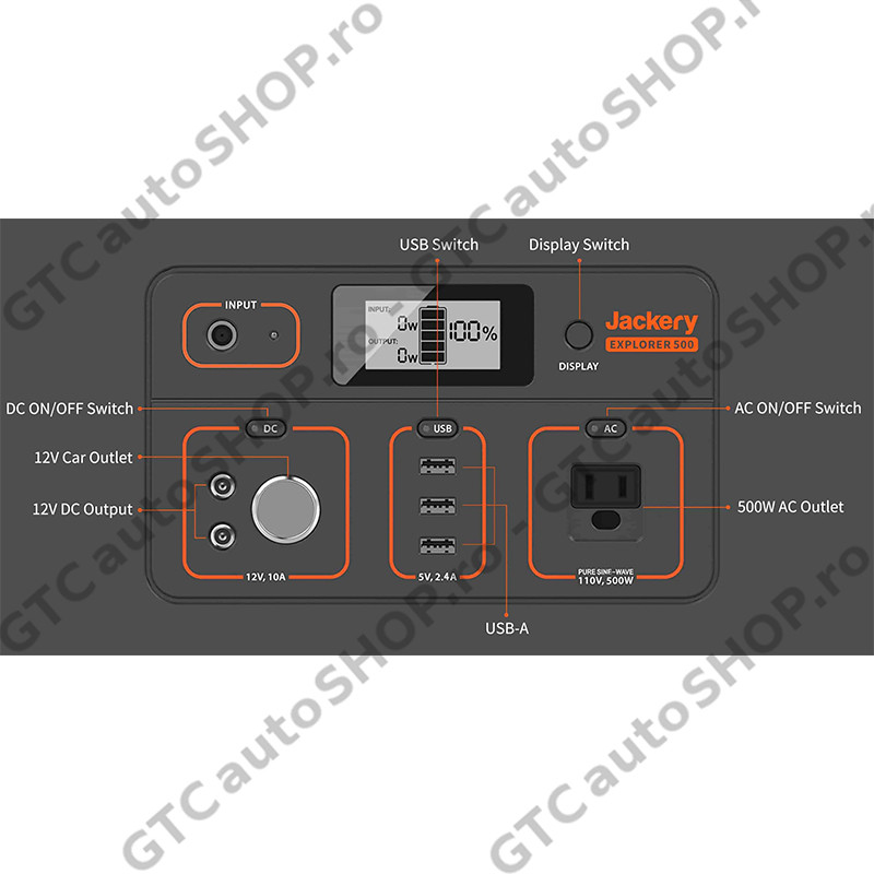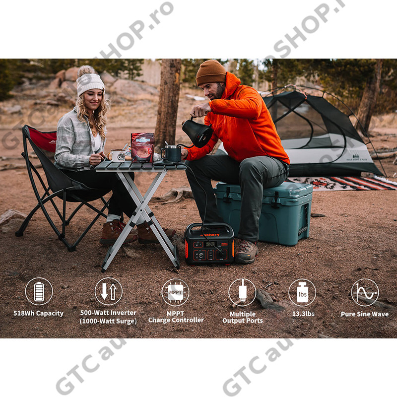 Capacitate mare: Jackery Explorer 500 are o putere de 518 Wh (24Ah. 21.6V) cu o baterie lithium-ion si un invertor cu unda pura sinusoidala. Generatorul are 1 priza AC (220V 500W 1000W varf), 4 porturi USB, 2 prize DC EU si 1 port auto pentru alimentarea lenta a echipamentelor precum frigidere auto mini, pompe de aer, TV etc.