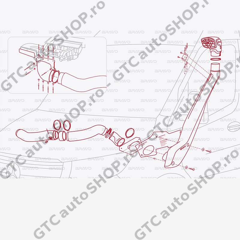 Kitul cuprinde snorkel, cap snorkel, sablon montaj si accesorii instalare.