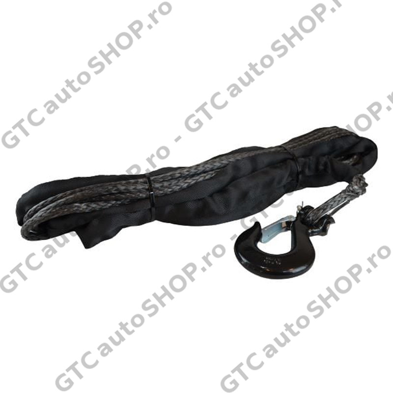 Cablu de troliu sintetic, grosime de 8 mm si lungime de 18 metri, prevazut cu protectie de copac, rodenta de otel si carlig.