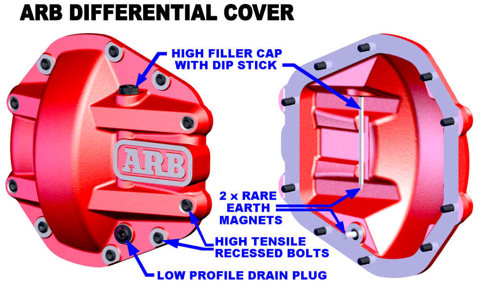 Atunci cand sunteti cu masina in natura, pericolele de a afecta puntile masinii sunt la tot pasul. Pentru a evita acest lucru cei de la ARB au creat acest capac de diferential. Construit dintr-un otel de mare duritate, capacul de diferential este destinat sa va protejeze coroana si pinionul, in timp ce are rolul de a rigidiza si ranforsa structura puntii. In timp ce acesta ofera o protectie foarte buna pe exterior, lucrurile nu se schimba cand vine vorba de interior; reviziile devin un lucru mult mai usor de realizat impreuna cu cele doua busoane, unul inferior de eliminare a uleiului si cel de superior de umplere. Busonul superior are o joja magnetica cu ajutorul careia putem verifica daca coroana sau pinionul au fost afectate deoarece aceasta joja atrage bucatelele metalice / pilitura rupte dintr-un element, si stim sa intervenim cu promptitudine.