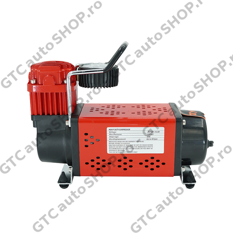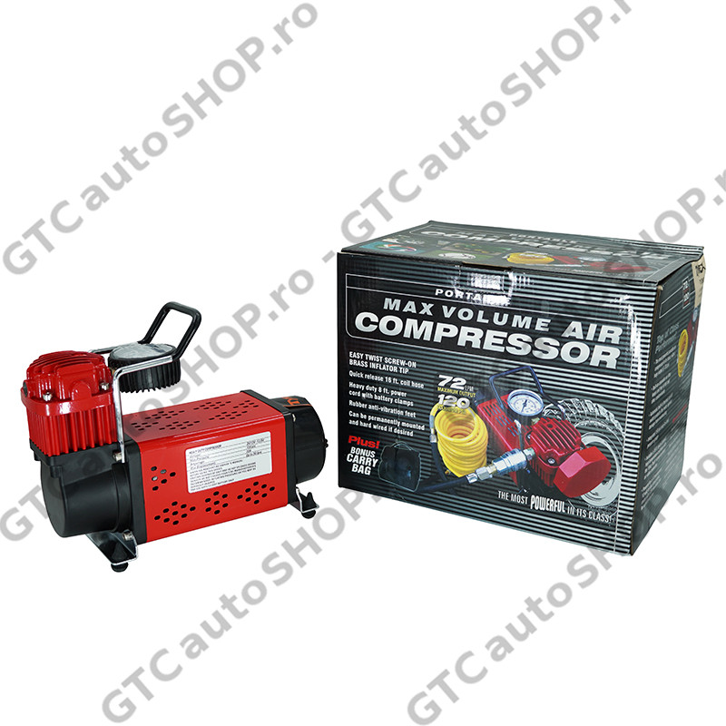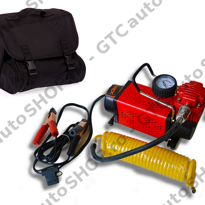 Pachetul include compresorul, un furtun spiralat de 6 metri cu cuple rapide, un pistol cu manometru si geanta de transport.