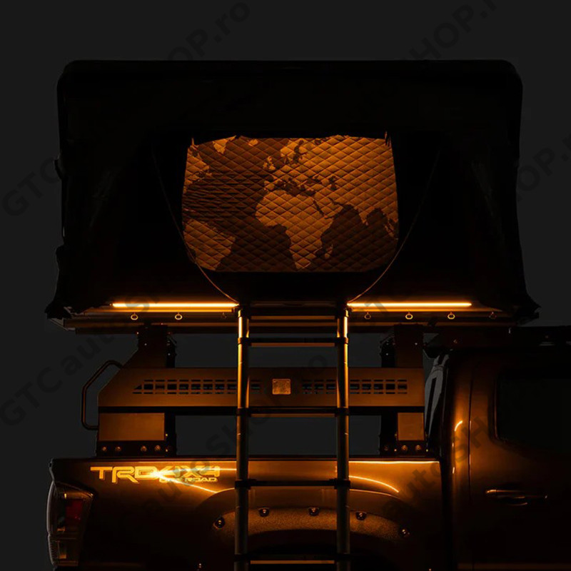 Iluminat nocturn - Benzile LED integrate, bicolore, alimentate prin USB*, lumineaza interiorul cortului si partea inferioara a podelei pliabile. Comenzile independente, cu variator de intensitate pentru fiecare banda, fac experieta de camping mai sigura si distractiva dupa lasarea intunericului. *Sursa de alimentare USB nu este inclusa.