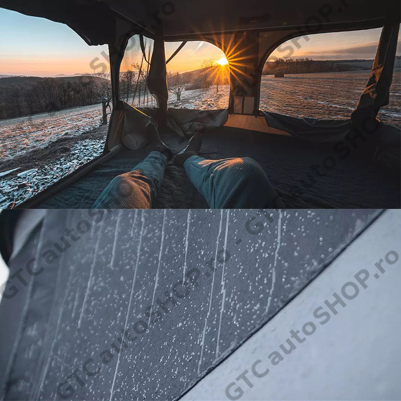 Spatiu de stocare intern – Corturile hardshell sunt prevazute cu o plasa de depozitare in partea superioara pe interior. Cand este inchis, cortul are un spatiu de 20 cm inaltime in care se pot depozita diverse obiecte precum: saci de dormit, paturi, perne, haine de dormit, scara cortului etc.