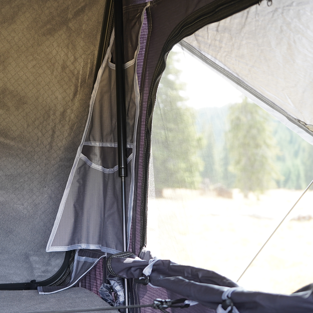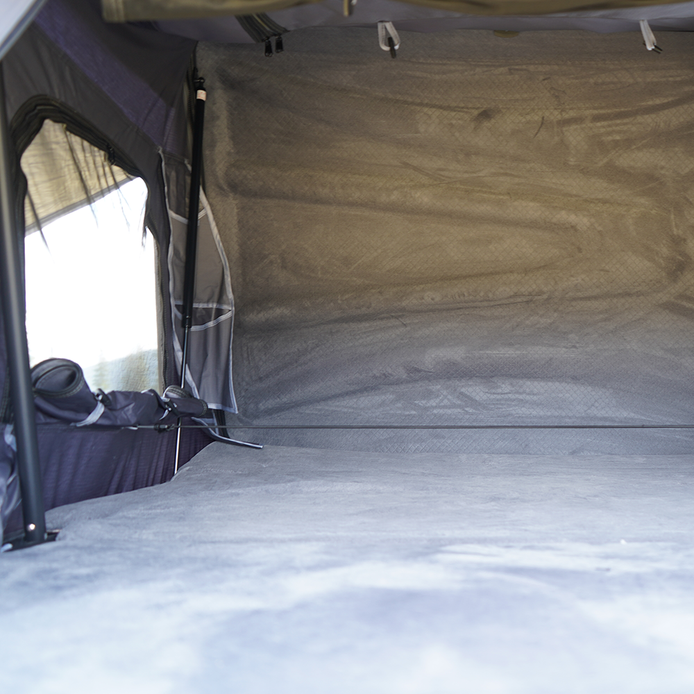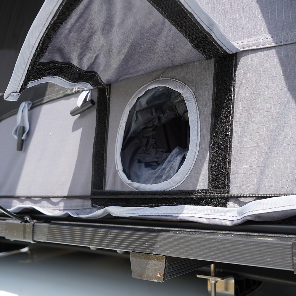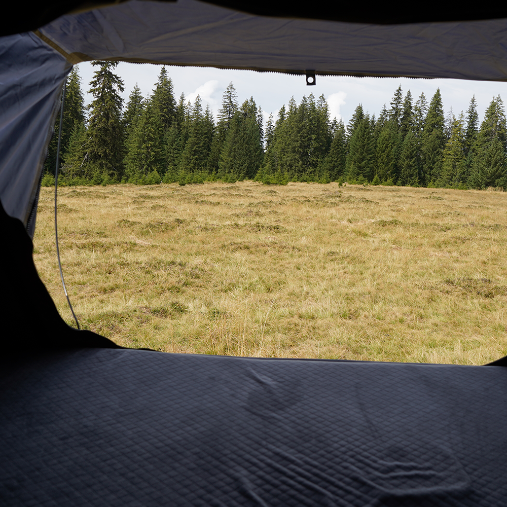Cortul are, de asemenea, o fereastra PVC integrata in acoperis, care permite luminii naturale sa patrunda in interiorul cortului si ofera o priveliste frumoasa catre cerul instelat.