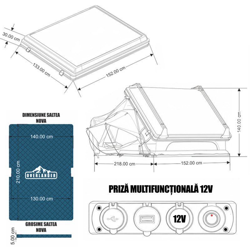 Bonus: Cortul include o priză multifuncțională în interior, care îți oferă acces la curent electric atunci când o conectezi la un powerbank sau direct la bateria mașinii — pentru iluminare, încărcarea dispozitivelor și confort deplin oriunde campezi.
