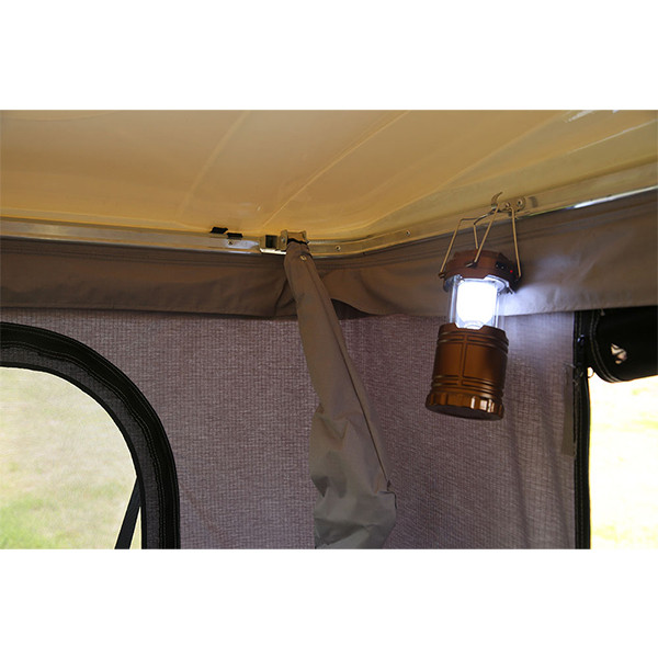 Structura interna si externa a cortului e sustinuta de bare din aluminiu pentru rezistenta ridicata. Se poate livra in doua variante: cu doua intrari laterale si doua ferestre sau cu o singura intrare pe laterala din spatele masinii si 3 ferestre, avand plasa de tantari.