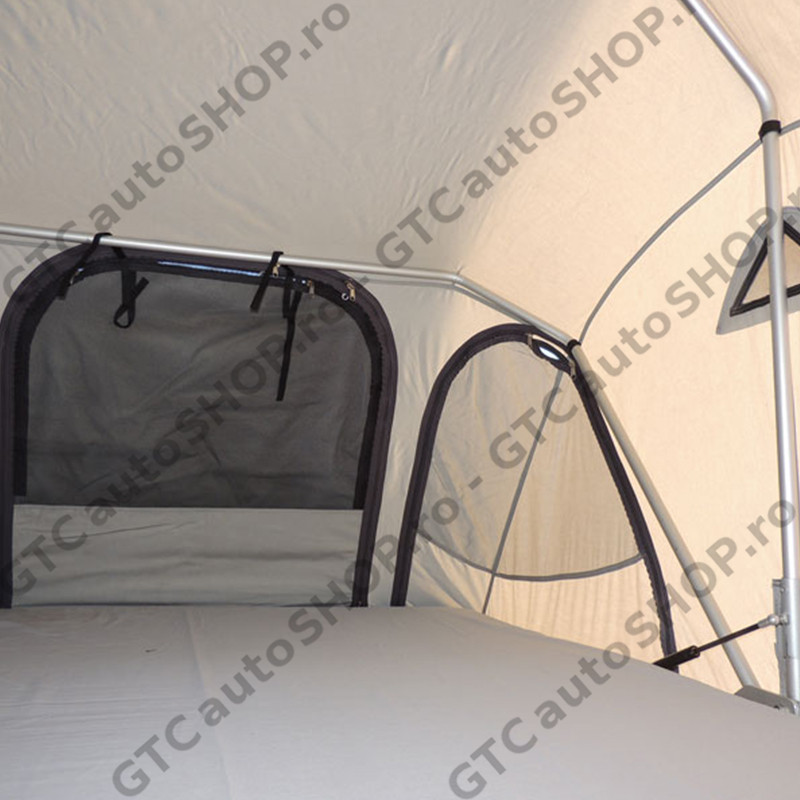 Protectie impotriva insectelor – Acest cort de pe acoperis are ferestre/usi cu plasa de tantari cusuta chiar in tesatura. Plasa de tantari este realizata dint-un material cu rezistenta mare. Toate fermoarele au cursore din cauciuc, un sistem simplu, astfel incat sa poate fi foarte silentios in timpul folosirii.