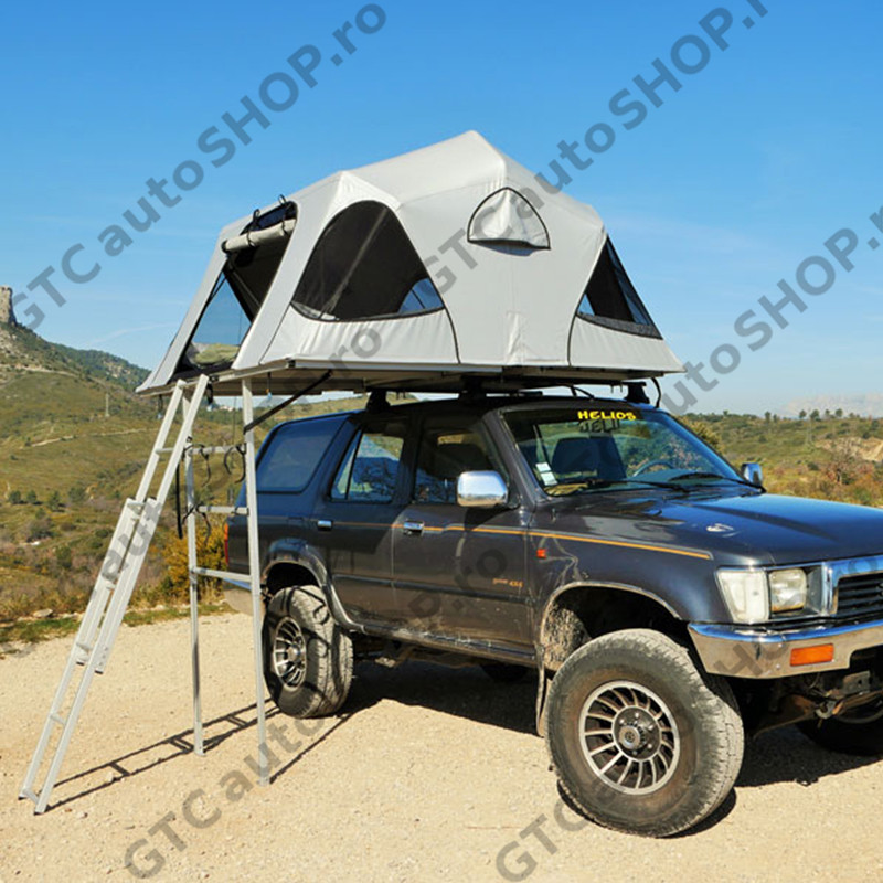 Scara telescopica – Picioarele telescopice asigura o stabilitate mare si siguranta cortului. Aceastea pot fi reglate individual in functie de sol. Scara poate fi fixata pe ambele parti ale cortului, asigurand o intrare sigura in cort in caz de vreme instabila. Se poate regla pe inaltimea vehiculului si are trepte antiderapante si ergonomice. Mecanismul de blocare este foarte sigur si impreuna cu scara rezista pana la 250 kg. Scara vine cu husa de transport din pvc.
