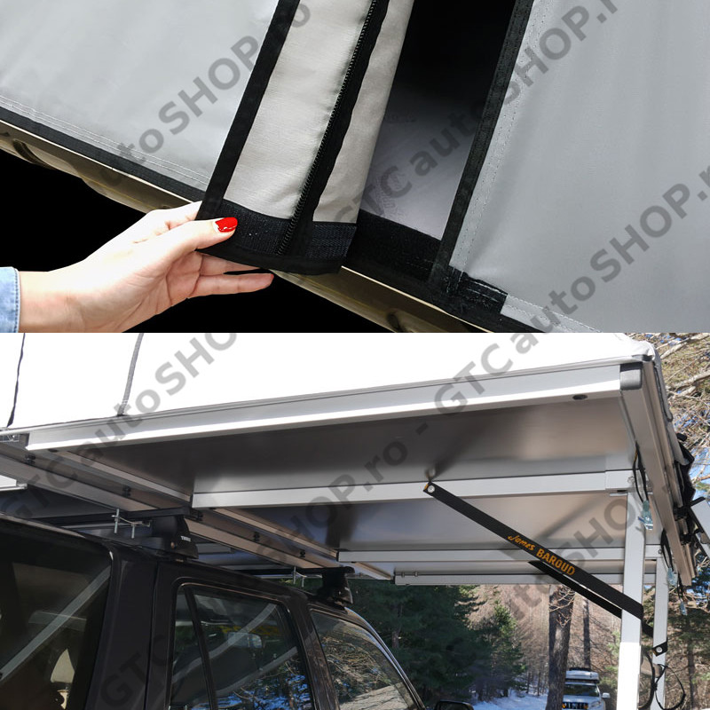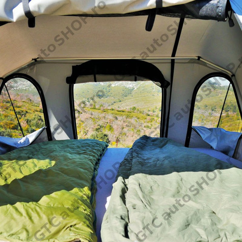 Protectie impotriva insectelor – Acest cort de pe acoperis are ferestre/usi cu plasa de tantari cusuta chiar in tesatura. Plasa de tantari este realizata dint-un material cu rezistenta mare. Toate fermoarele au cursore din cauciuc, un sistem simplu, astfel incat sa poate fi foarte silentios in timpul folosirii.