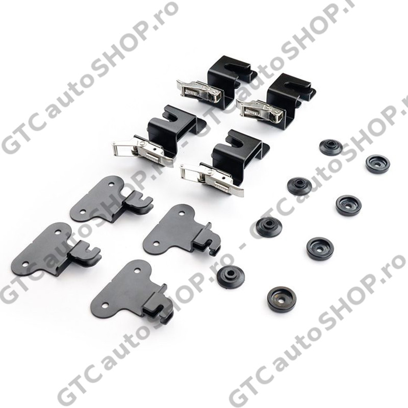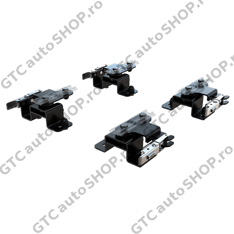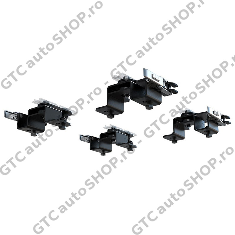 - Kit-ul contine 4 suporturi de baza cu profil redus ce se prind cu suruburi de portbagaj si 4 suporturi cu bucse cu auto-aliniere ce se fixeaza de canalele de baza ale cortului folosind setul de distantiere corespunzator
