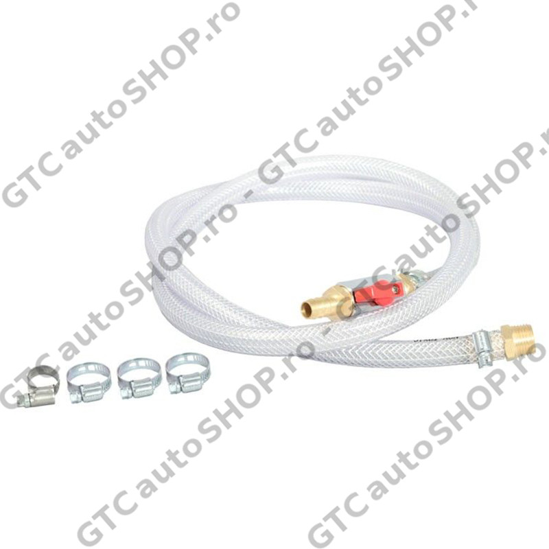 Furtunul are diametru de 12mm si lungime de 1500mm. Vine impreuna cu 3 fitinguri de alama, coliere metalice si robinet metalic.