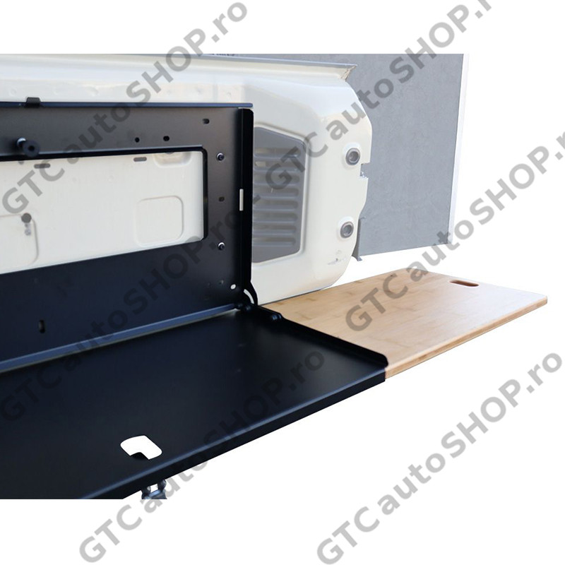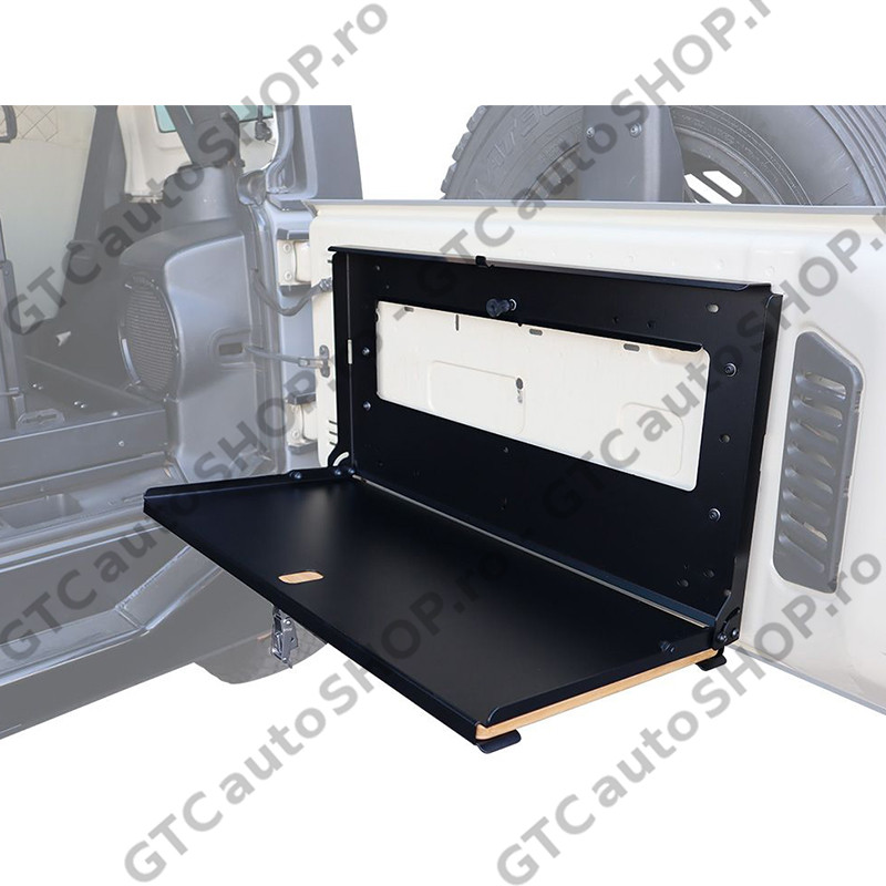 Obtineti mai mult spatiu pentru pregatirea alimentelor, pentru a lucra sau pentru alte activitati, rapid si usor direct pe hayon-ul vehiculului dvs. Aceasta masa pliabila pentru hayon, pregatita pentru orice aventura, se monteaza pe usa batanta din spate a Jeep-urilor JK/JKU/JL si a unor SUV-uri, inclusiv Defender-ul L663 sau la camioanele care au usi batante in spate. Suportul integrat ajuta la depozitarea in siguranta a mesei pana la urmatoarea utilizare.