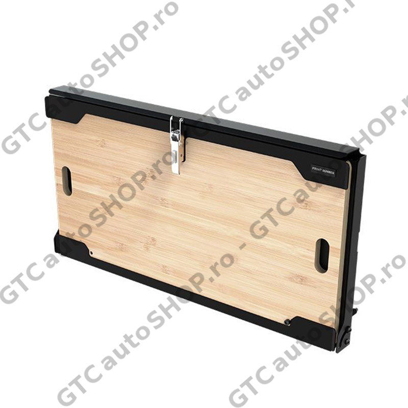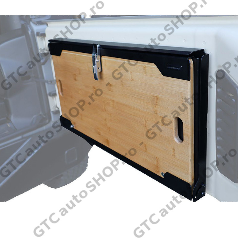 Nota! Este compatibila cu Jeep Wrangler JK, JKU, JL si Defender L663. Pentru a se monta pe alte SUV-uri, camioane sau remorci, este nevoie de o suprafata metalica din otel cu dimensiuni de 685 mm x 376 mm si necesita gaurire. Masa nu este compatibila cu sertarul Front Runner dedicat pentru Land Rover Defender 110 (L663).