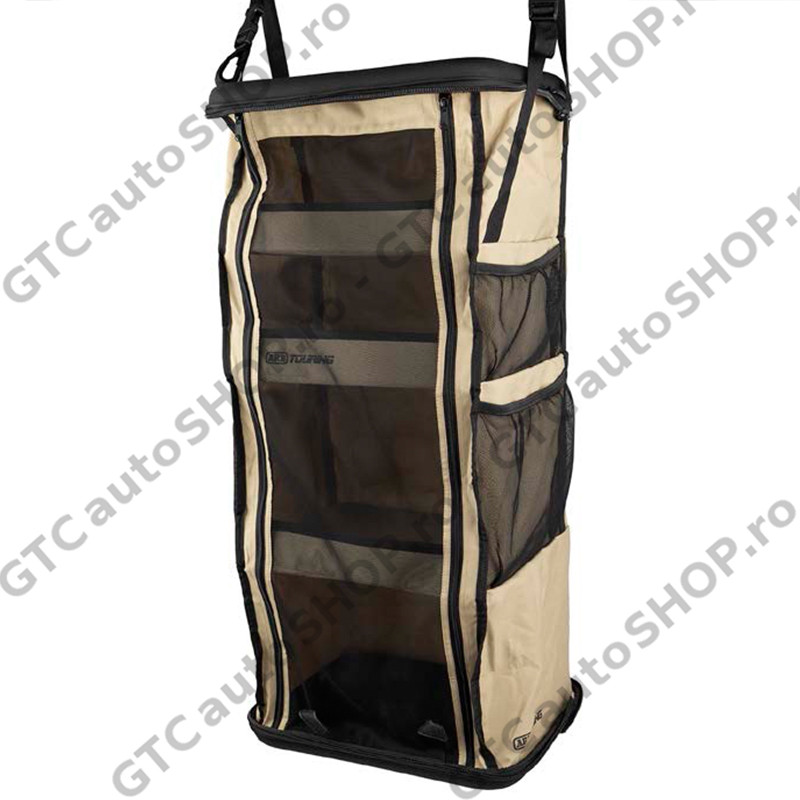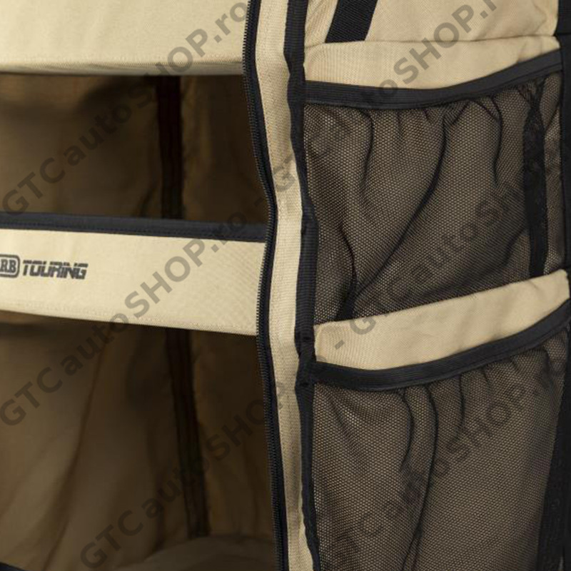 Realizat din poliester oxford durabil, organizatorul este echipat cu patru rafturi interioare spatioase de diferite inaltimi, pentru a depozita toate obiectele tale. Montarea este simpla si se face cu ajutorul a doua curele reglabile cu catarama care asigura o fixare usoara atunci cand este necesar. Designul inteligent include patru buzunare exterioare laterale, ideale pentru obiecte mici si usor accesibile, precum chei, crema de protectie solara, solutie impotriva insectelor etc., astfel incat stii intotdeauna unde se afla acestea.