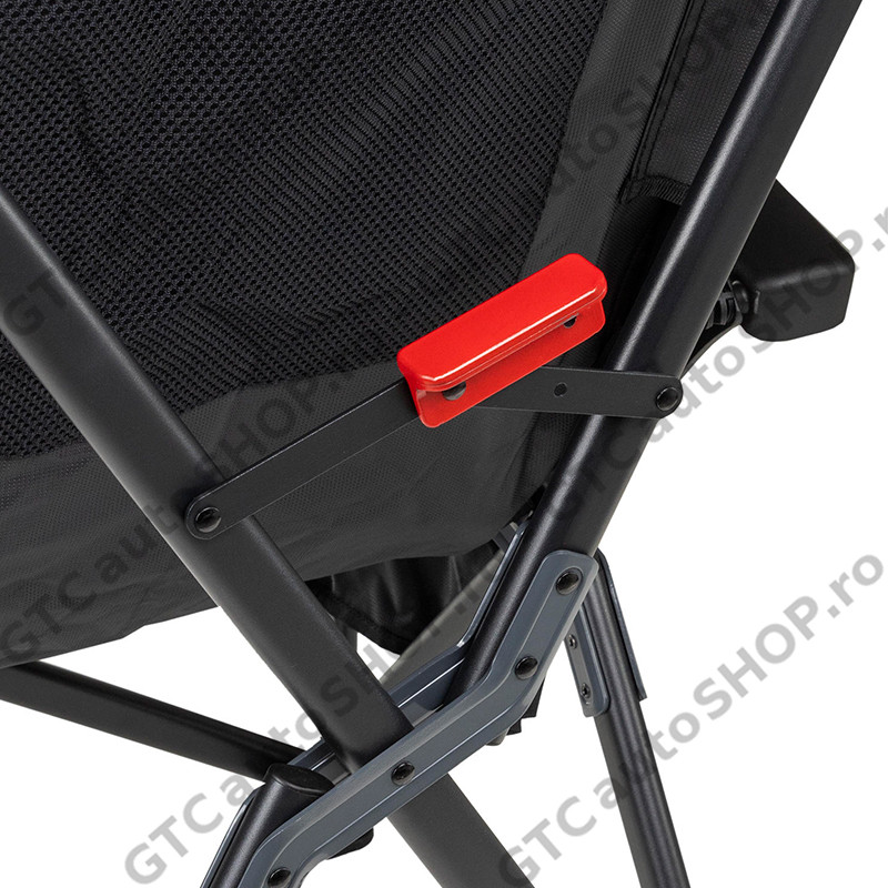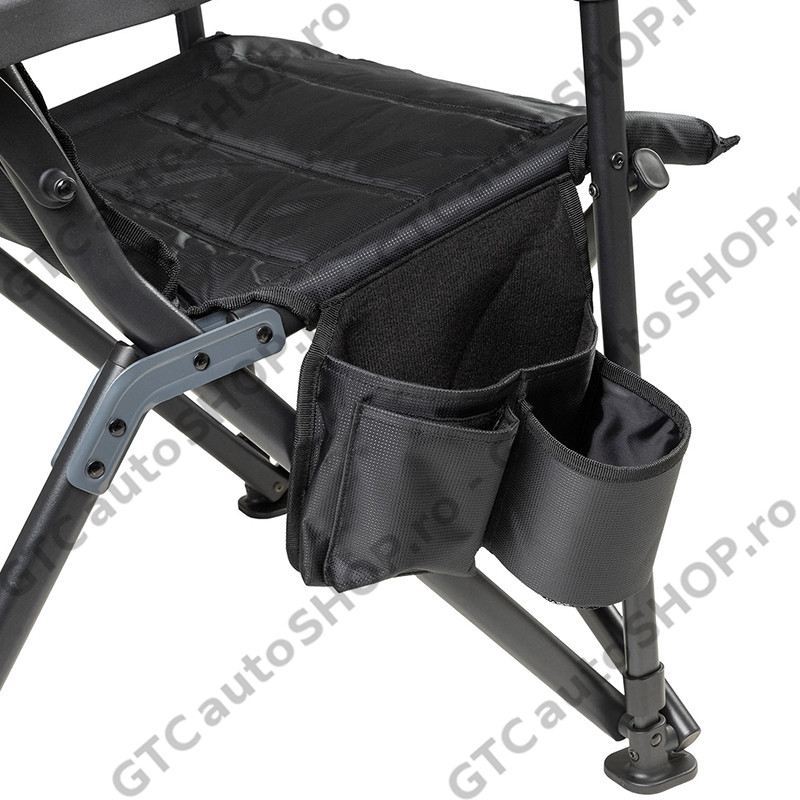 Este prevazut cu multiple spatii de depozitare pentru articolele tale esentiale, un buzunar din plasa pe partea din spate a spatarului, cu un suport pentru pahare si un buzunar aditional pe partea laterala. In plus, scaunul vine cu o geanta de transport spatioasa din poliester 600D, ce are curea de umar captusita, pentru depozitare si transportare usoara.