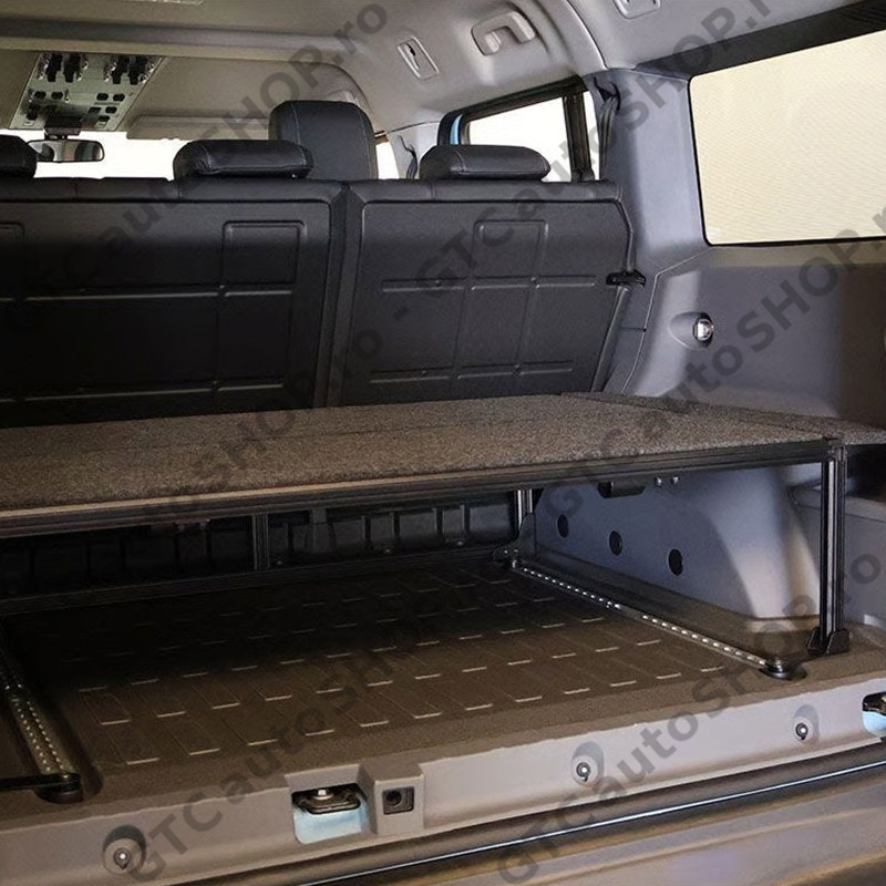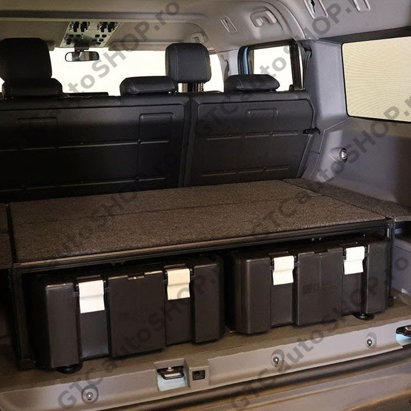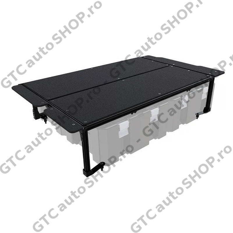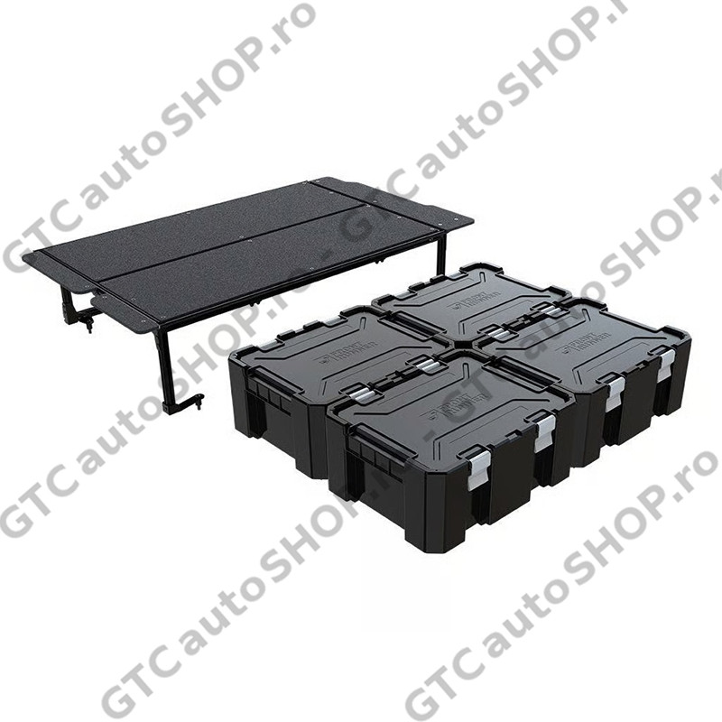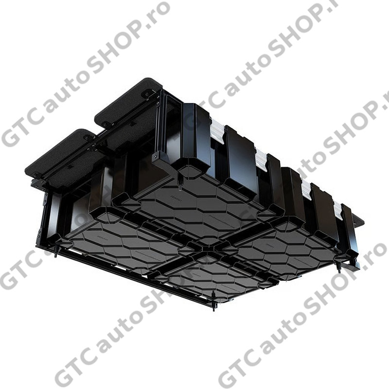 Acest sistem de depozitare este echipat cu un mecanism cu arc pentru a fixa Wolf Pack Pro in loc, prevenind vibratiile si miscarile excesive. Capacitatea de incarcare a puntii superioare este de 80 kg si poate fi utilizata si pentru montarea platformelor Front Runner Cargo sau a sliderelor pentru frigidere.