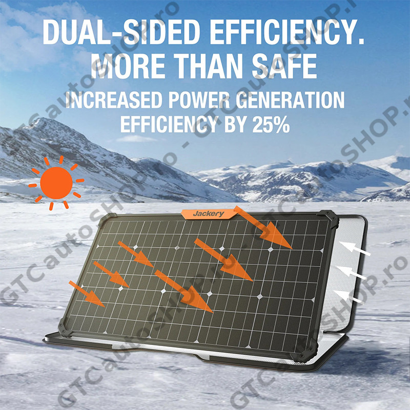 Varianta imbunatatita a panoului solar Jackery Solarsaga poate genera electricitate cu ajutorul ambelor fete. Sticla extra-alba (rata de transmitere de 92%) folosita pe spatele panoului ajuta la cresterea ratei de conversie. O geanta de transport cu reflexie special conceputa pentru acest panou ajuta la distribuirea extra a energiei solare.