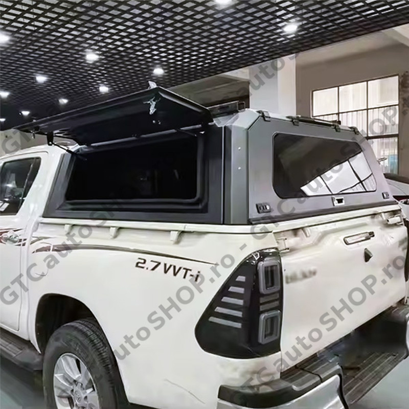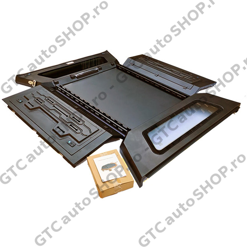 - Pe laterale sunt prevazute geamuri metalice cu incuietori si amortizoare pentru o deschidere usoara. In partea din fata, spre cabina, hardtop-ul este prevazut cu geam transparent iar in partea din spate spre exterior este prevazut cu geam fumuriu.