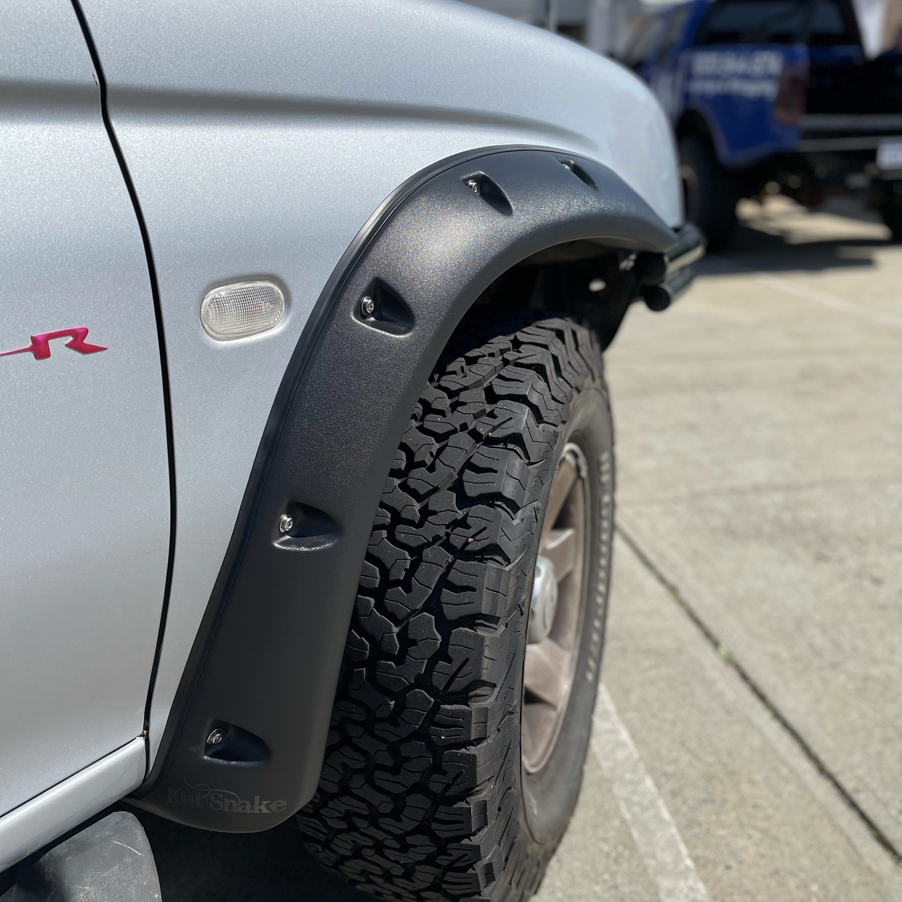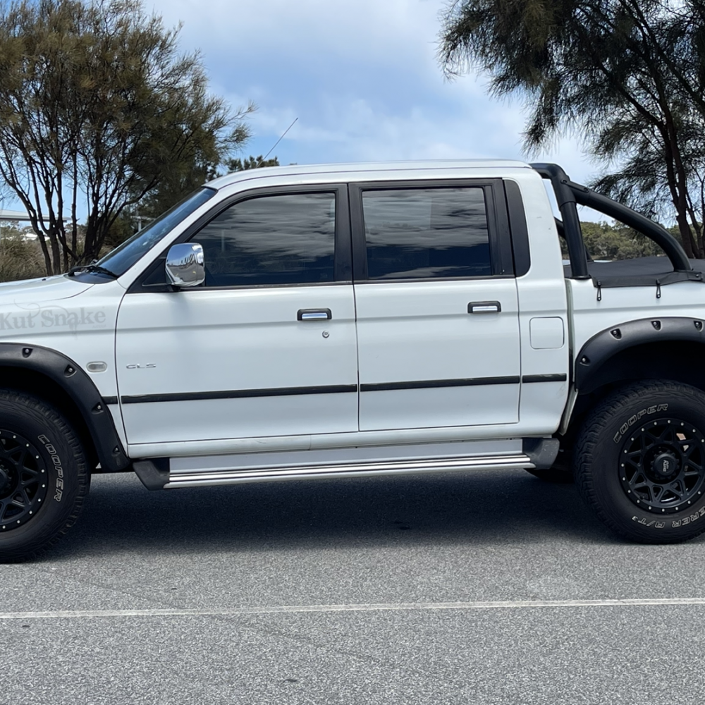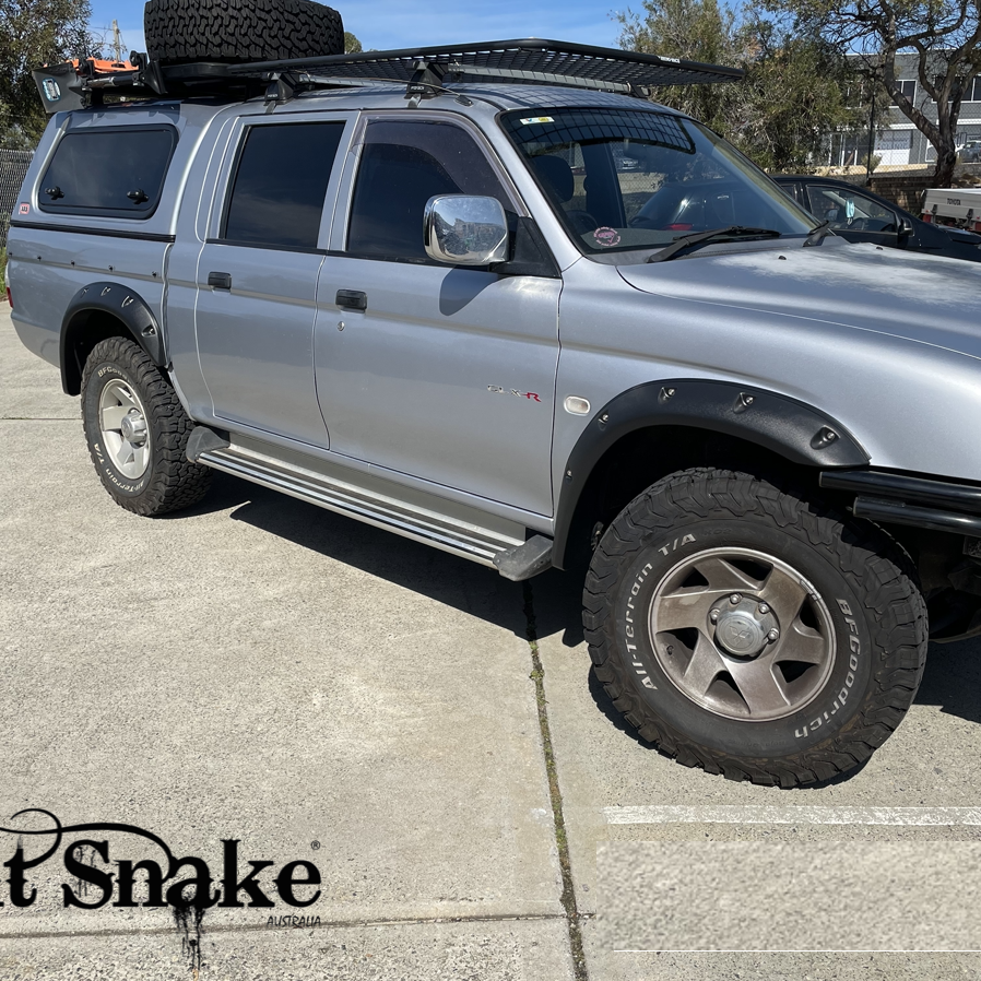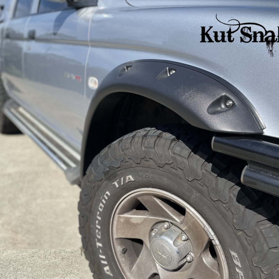 Set aparatori de noroi pentru aripi (overfendere) de la Kut-Snake Australia, de 75mm latime. Sunt dedicate pentru Mitsubishi L200 MK productie 1996-2006.