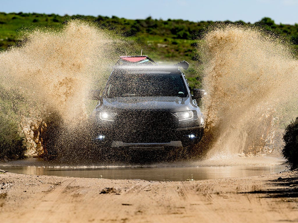 Portbagaj Front Runner Slimsport pentru montare pe plafonul Ford Ranger, inclusiv modelul Wildtrak si Raptor, productie 2012-2022, cu pre-echipare pentru montarea unei bare Led Osram VX1000-CB SR.