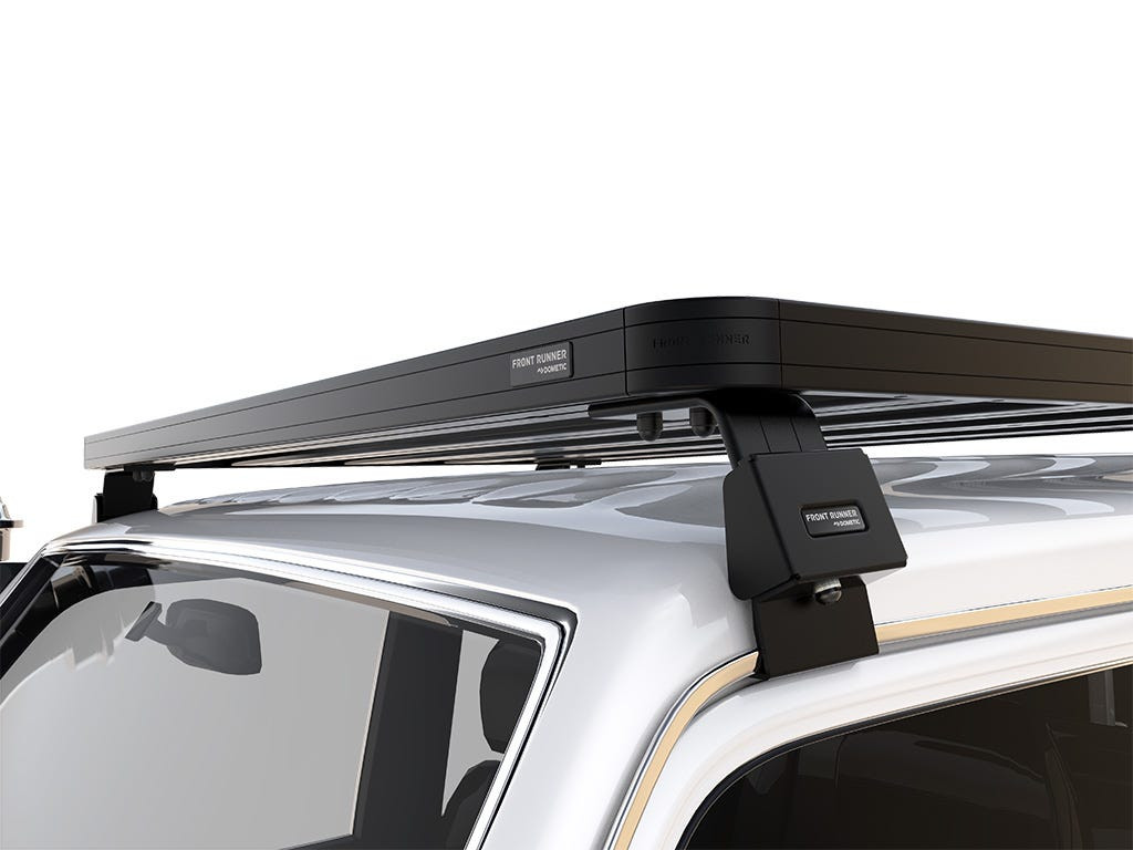Acest kit portbagaj plafon Slimline II 3/4, pentru transport marfă, cu lungimea de 954mm/37.6'', pentru Toyota Land Cruiser DC, conține platforma Slimline II și deflectorul de vânt, precum și 4 picioare de montaj pe jgheab pentru fixarea portbagajului pe vehicul.
